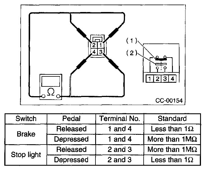 Measure the brake switch (1) and stop light switch (2) resistance.