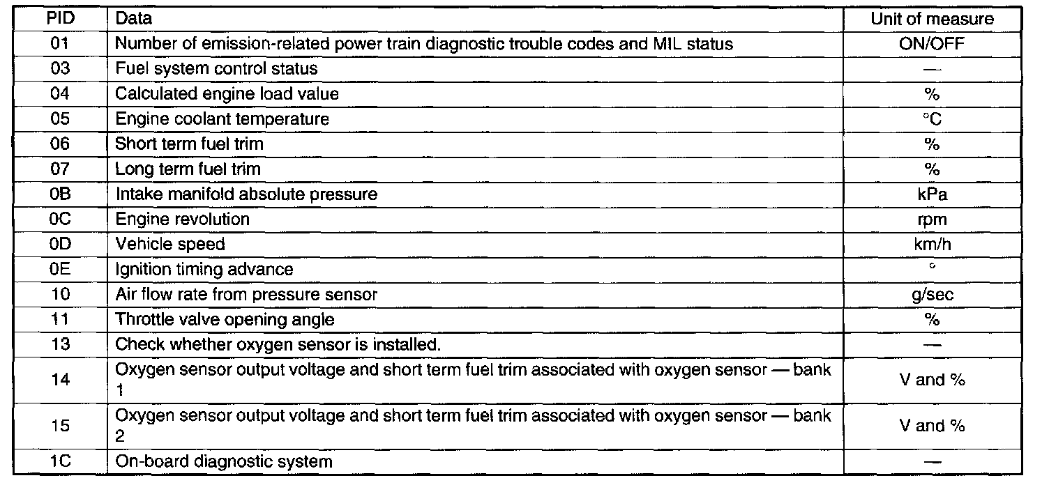 A list of the support data and PID (Parameter Identification) codes are shown in the table.