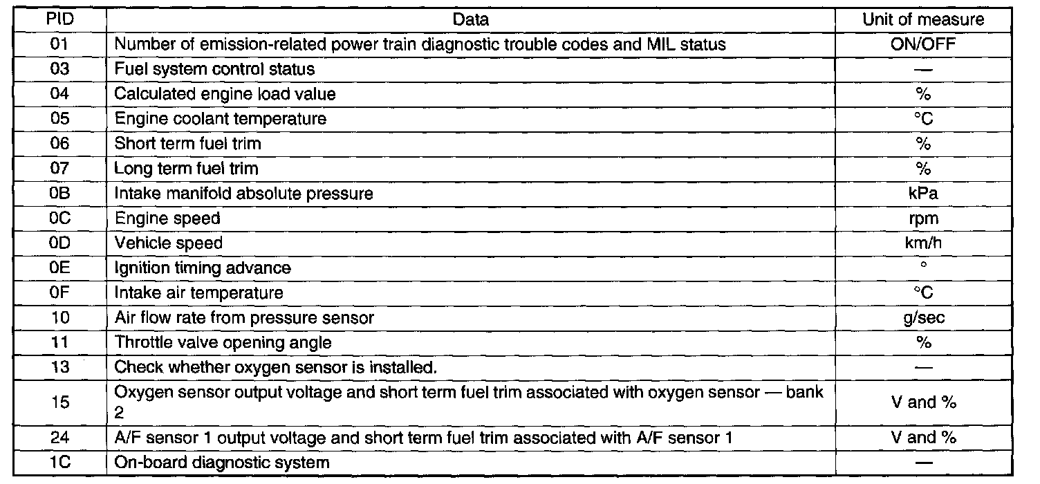 A list of support data and PID (Parameter Identification) codes are shown in the table.