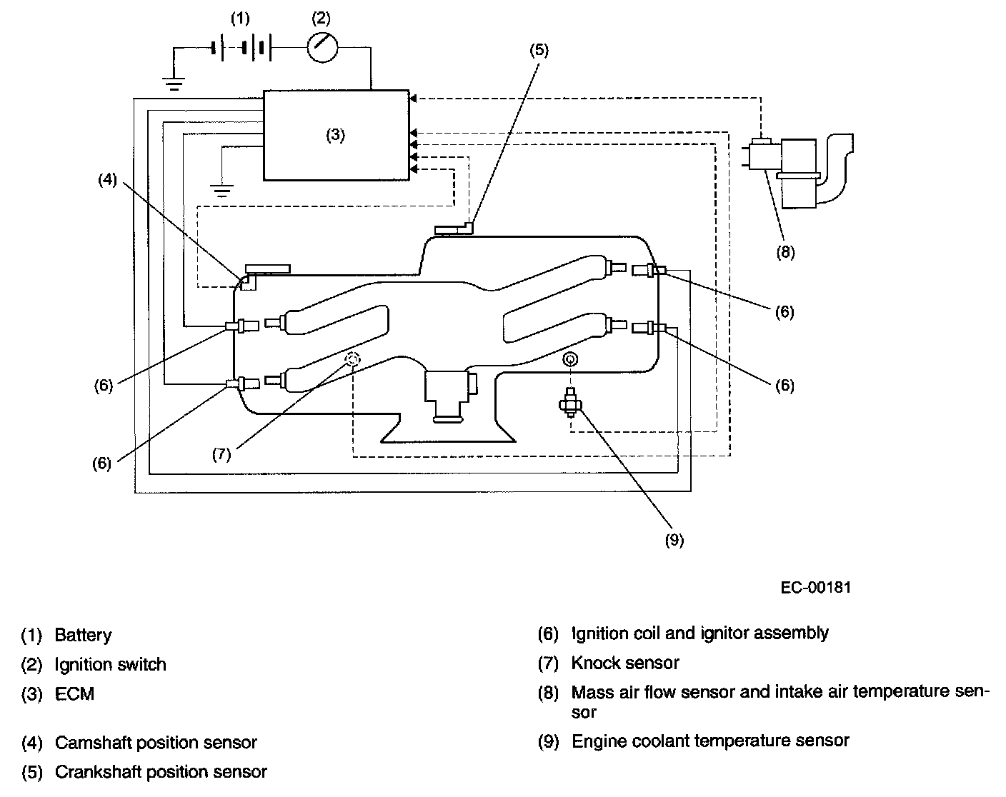 The ECM monitors the operating condition of the engine using the signals from the sensors and switches shown and determines the ignition timing most appropriate for each engine operating condition. Then it ends a signal to the ignitor, commanding generation of a spark at that timing.