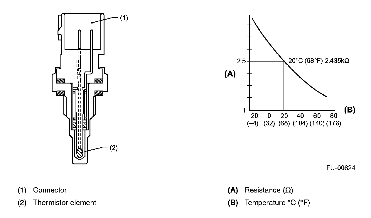 The engine coolant temperature sensor is located on the engine coolant pipe. The sensor uses a thermistor whose resistance changes inversely with temperature. Resistance signals as engine coolant temperature information are transmitted to the ECM to make fuel injection, ignition timing, purge control solenoid valve and other controls.