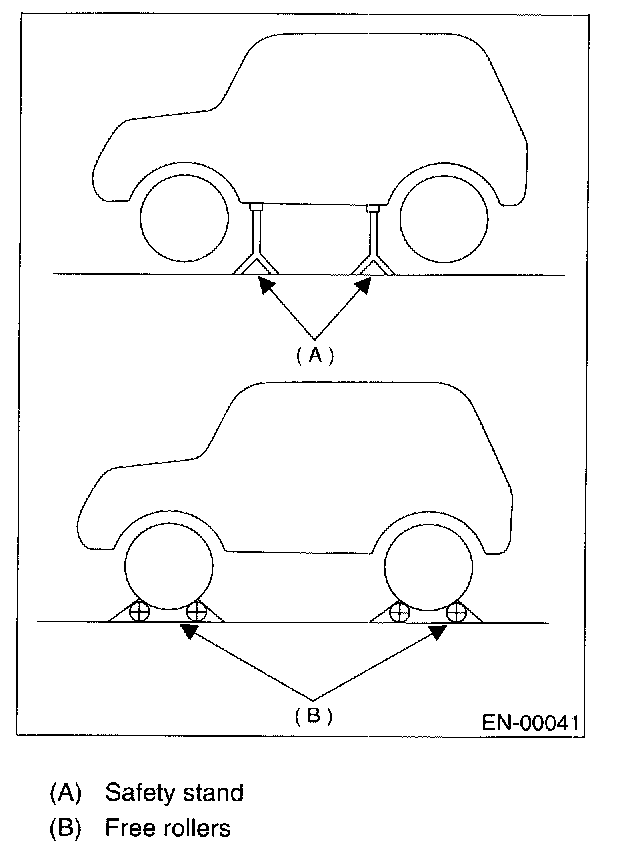 - In order to prevent the vehicle from slipping due to vibration, do not place any wooden blocks or similar items between the safety stands and the vehicle.