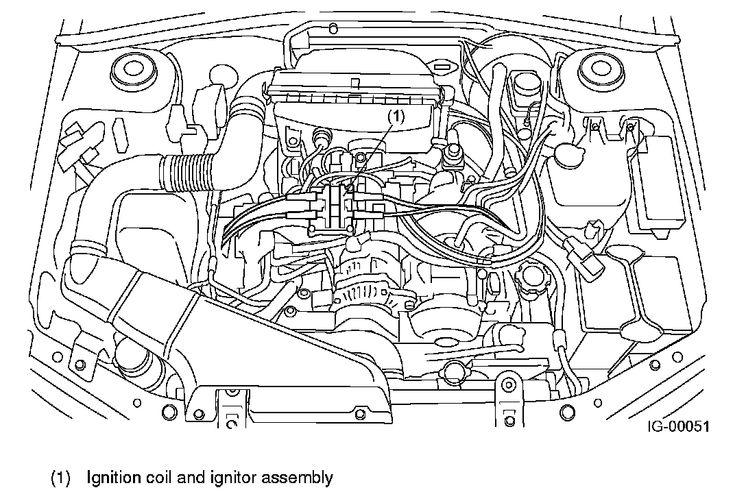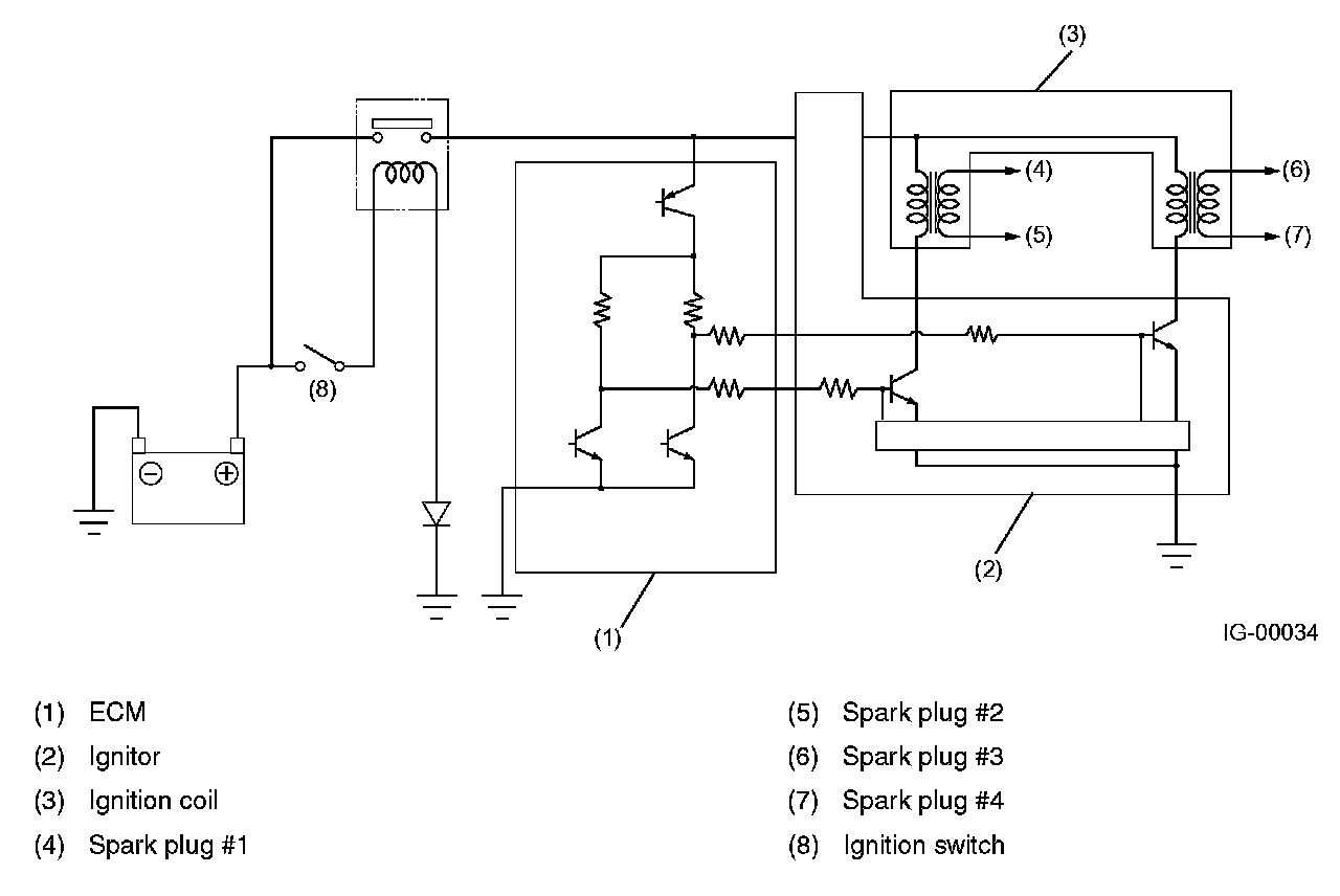 Ignition coils are made integral with an ignitor. The ignition system is of a dual-ignition-coil design, each coil causing two plugs to generate sparks simultaneously.In response to the signal from the ECM, the ignitor supplies current to an ignition coil and the ignition coil supplies high-voltage current to a pair of spark plugs (#1 and #2 or #3 and #4) simultaneously.