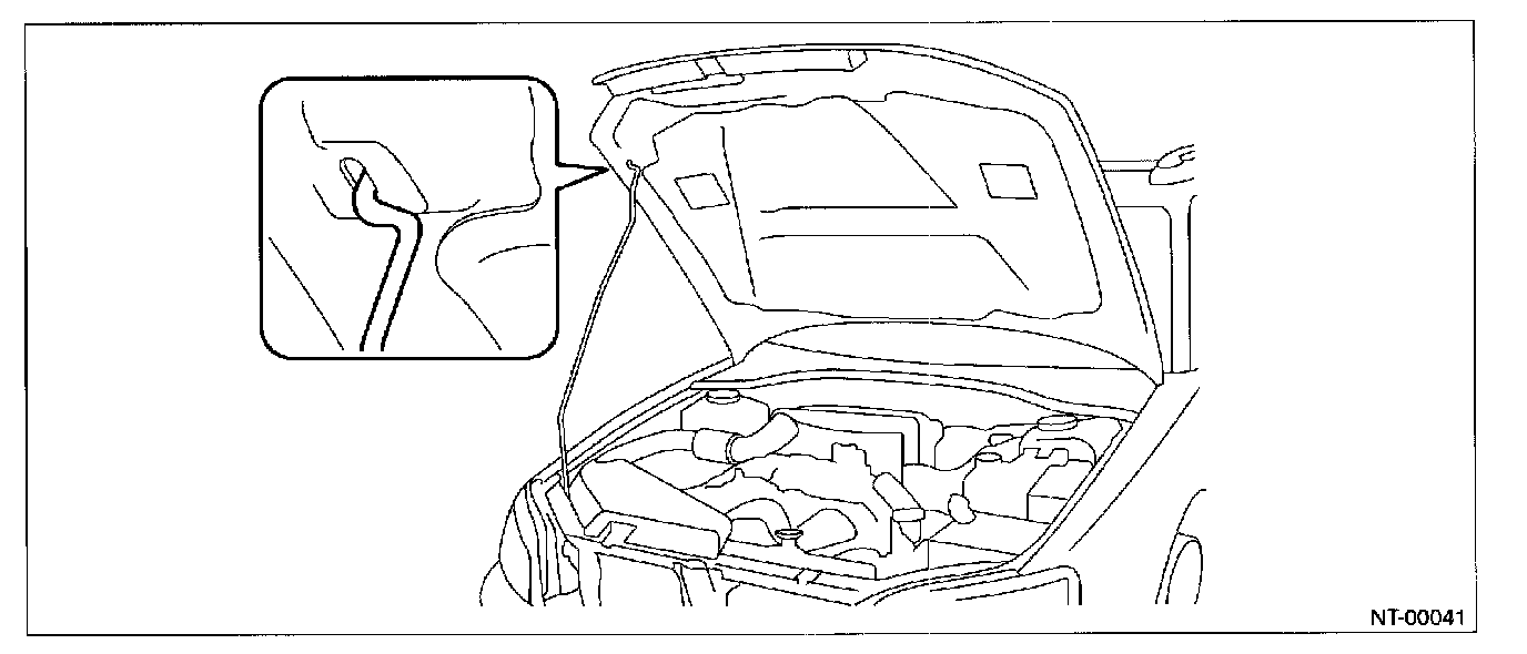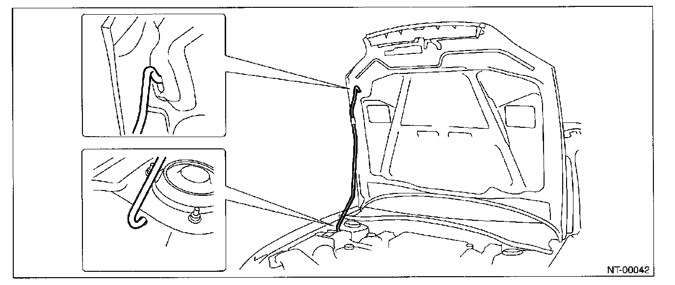 NOTE: Before setting the hood in this position, remove the windshield washer hose attaching clip from the hood.