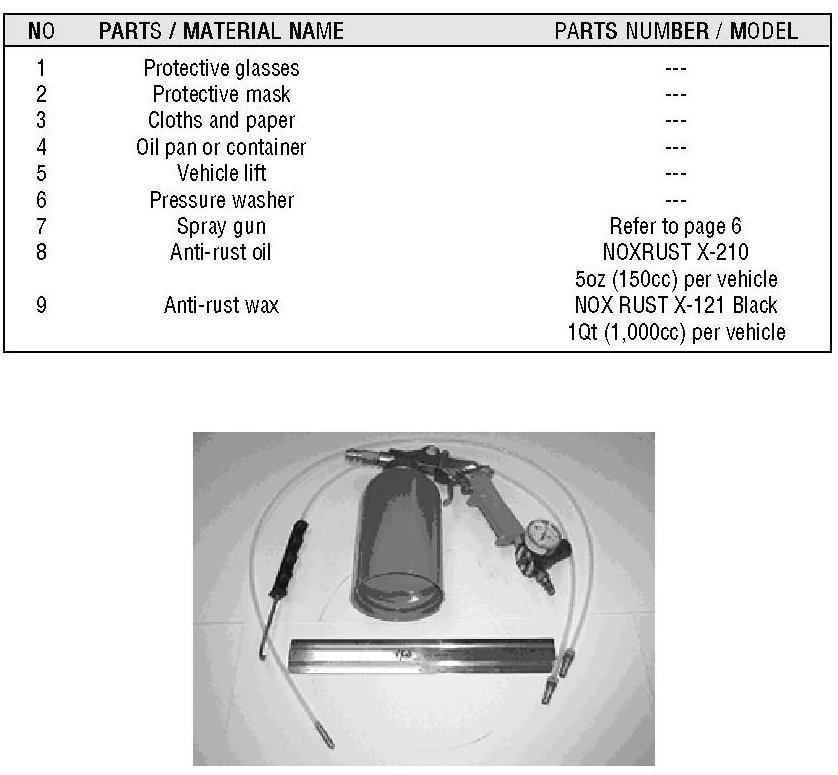 Spray time of anti-rust agent and length of spray nozzle to be inserted into the sub-frame corresponding to the holes located at bottom of the frame are identified in the following information.
