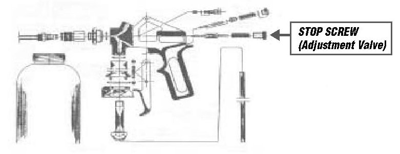 Before filling the gun, turn the stop screw clockwise until completely closed. Draw a line down the middle of the stop screw using a marker. This line will be used to determine the number of turns needed for optimal spray of the waxes.