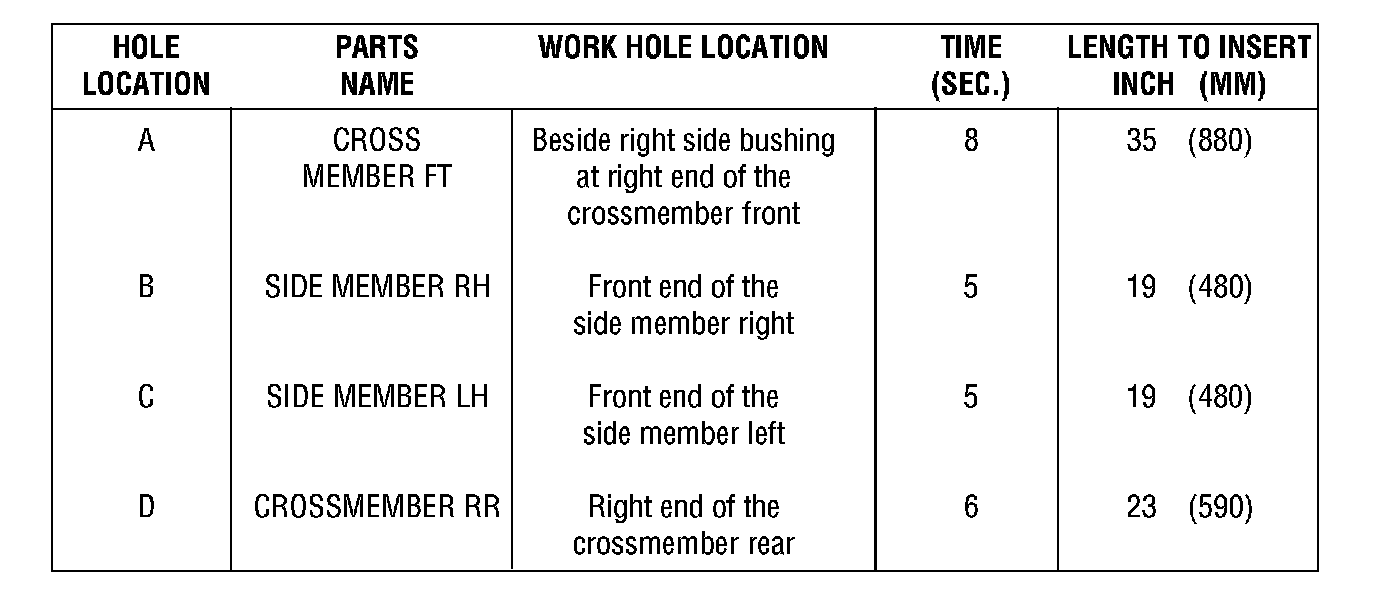 Insert the 360° spray nozzle into opening (D) located in bottom of the crossmember rear at the right end connected to the side member until it touches the side member of the other side. This area is approximately 23 inches (590 mm) long. Spray anti-rust agent for 6 seconds while pulling the spray nozzle back to the original opening (D).