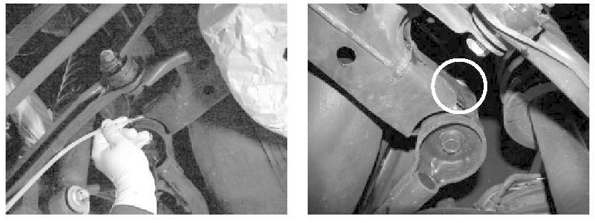 Insert the 360° spray nozzle into hole (C) at front end of the side member until it touches the outer tube of the rear bushing at the other end of the side member. Spray anti-rust wax for 8 seconds while pulling the spray nozzle back to the original opening.