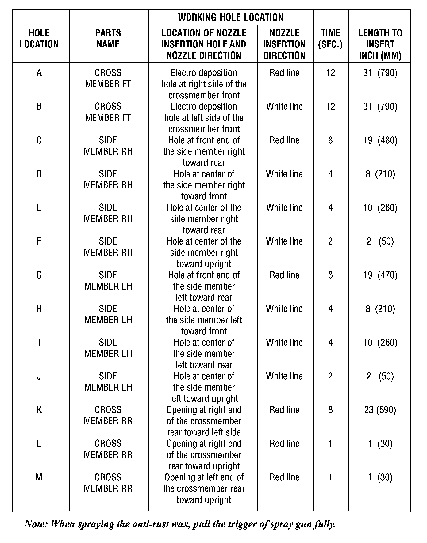Spray time of anti-rust wax and length of the spray nozzle to be inserted into the sub-frame corresponding holes are described as shown.