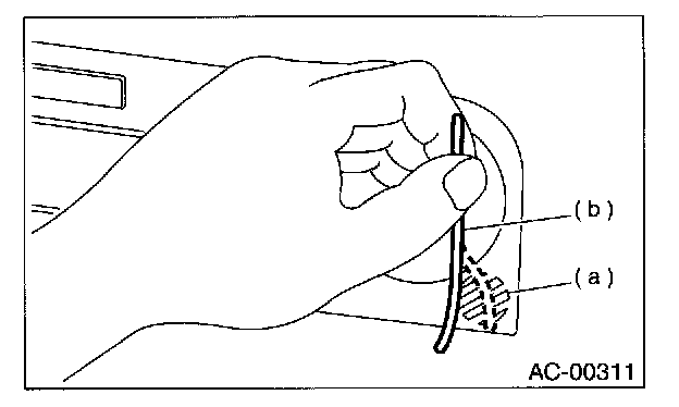 3. Firmly hold a thin thread (b) in front of the in-vehicle sensor suction port (a) for the auto A/C control unit and check that the thread moves towards the port indicating that air is being sucked into the port.