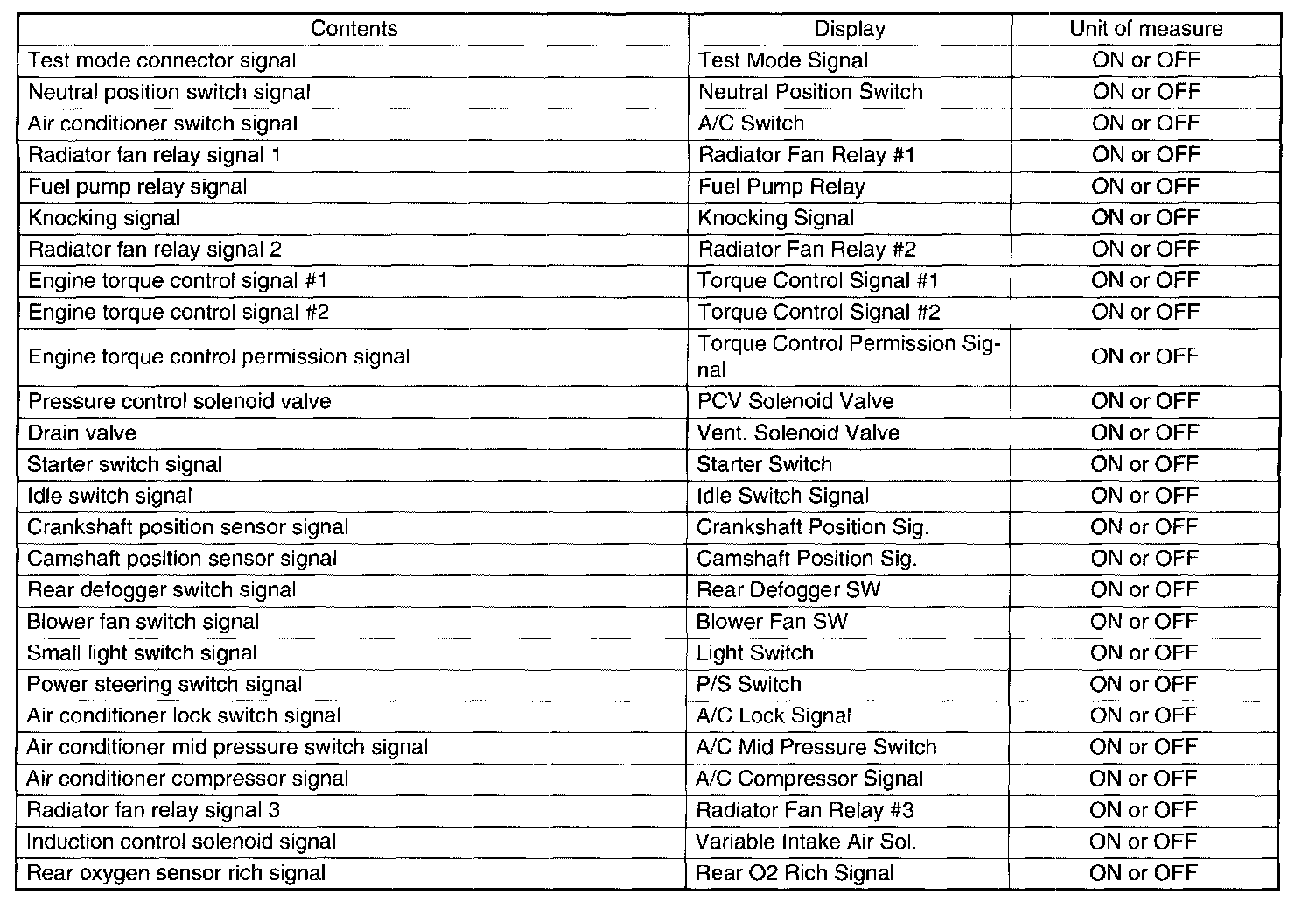 The signal which notifies whether or not torque down is possible is displayed. This signal is transmitted from the ECU in response to a torque down signal from the TCU. When torque down is prohibited, ON is displayed. When permitted, OFF is displayed.