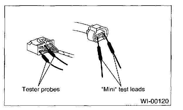 6. When checking continuity between connector terminals, or measuring voltage across the terminal and ground, always contact tester probe(s) on terminals from the wiring connection side. If the probe is too thick to gain access to the terminal, use "mini" test leads.