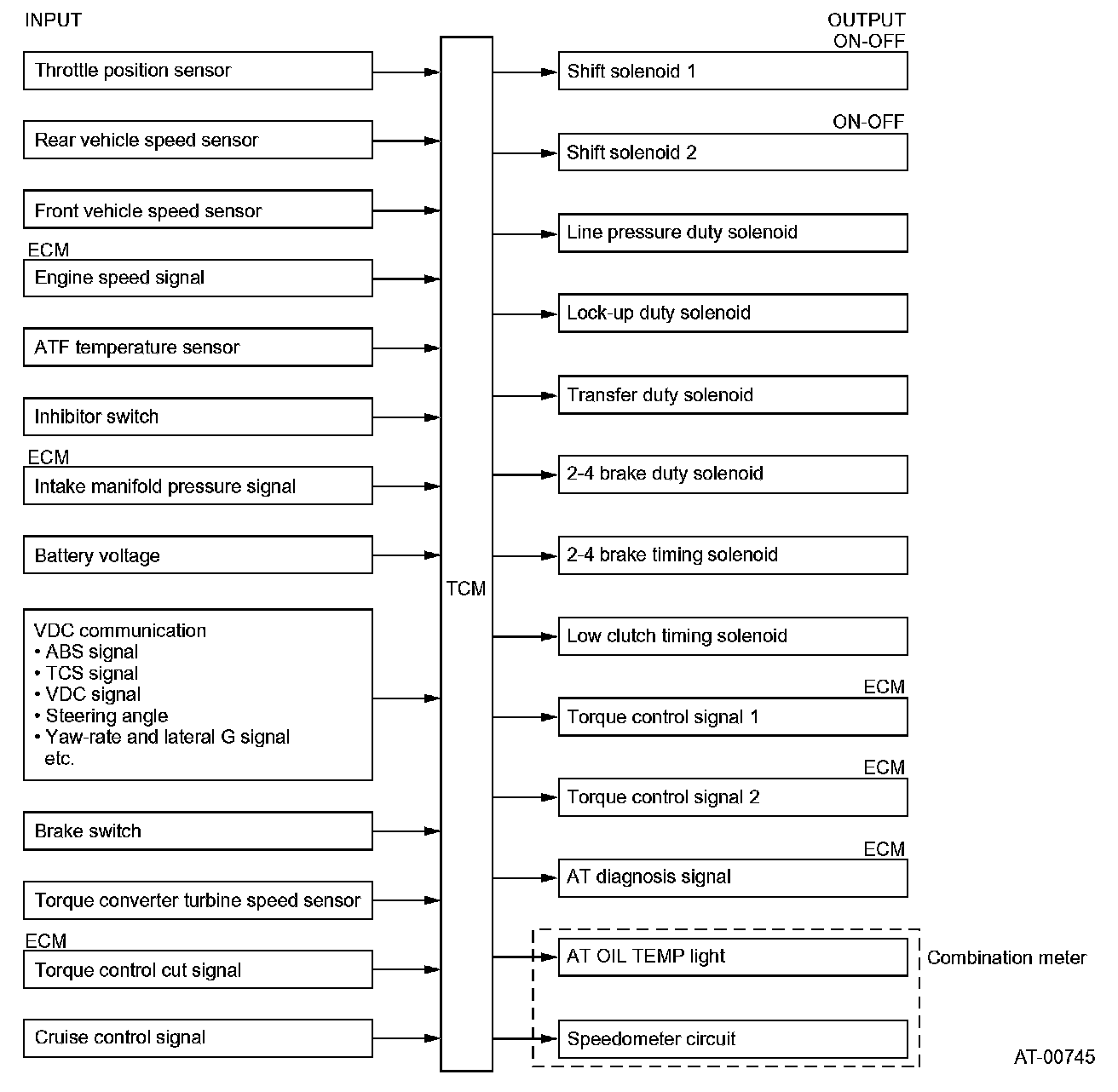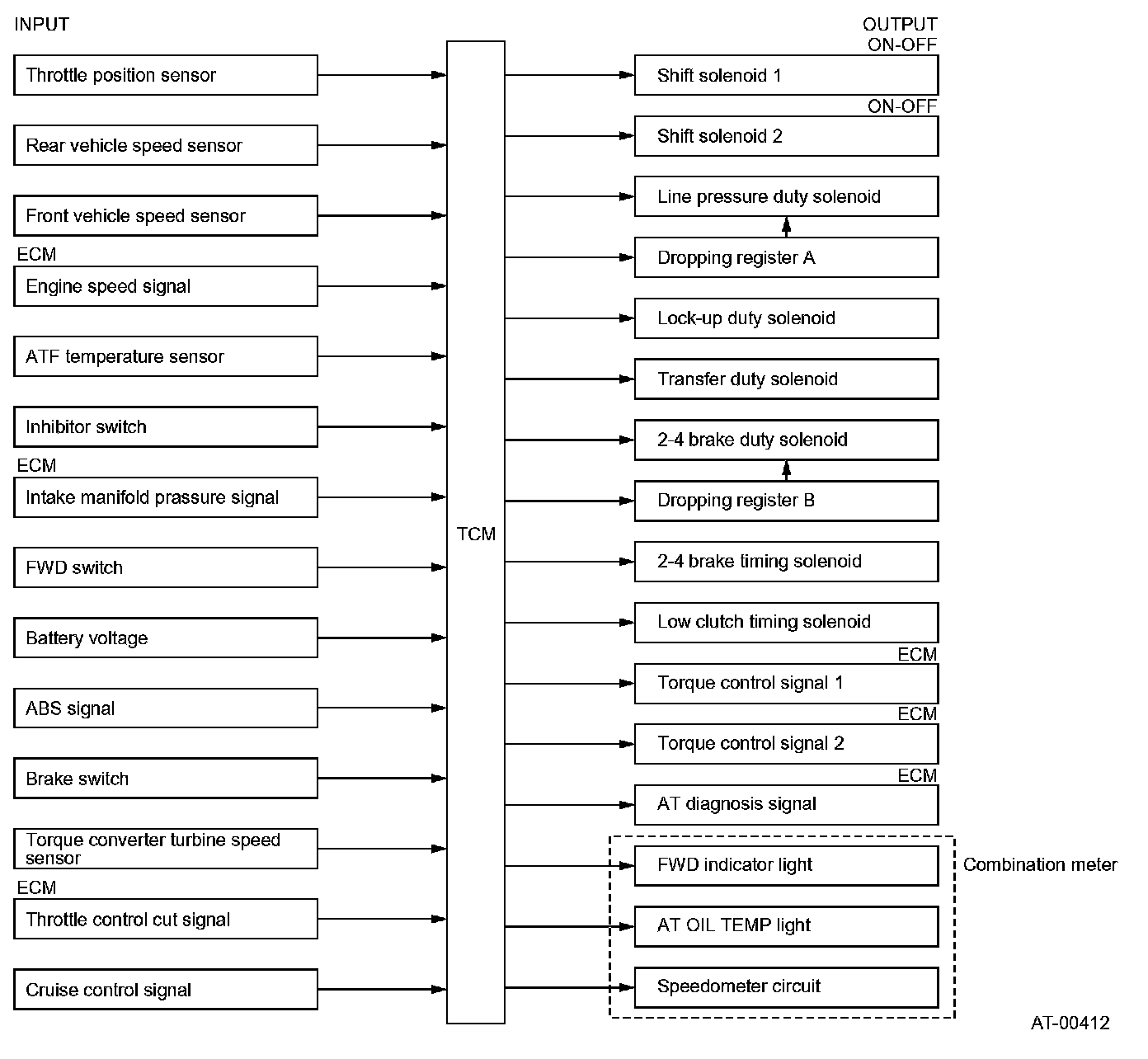 The electrohydraulic control system for the transmission and transfer consists of various sensors and switches, a transmission control module (TCM) and the hydraulic controlling units including solenoid valves.The system controls the automatic transmission operation, including gear shifting, lock-up clutch operation, line pressure, automatic control pattern selection ("Base" and "Power"), and gear-shift timing.It also controls the operation of the transfer clutch.The TCM determines vehicle operating conditions from various input signals and controls a total of eight solenoids (shift solenoids 1 and 2, low clutch timing solenoid, 2-4 brake timing solenoid, line pressure duty solenoid, lock-up duty solenoid, transfer duty solenoid, and 2-4 brake duty solenoid) by sending appropriate signals to them.