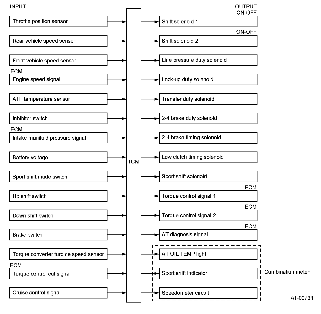The TCM converts the signals into pulse signals and outputs them to both the engine control module (ECM) and the combination meter.