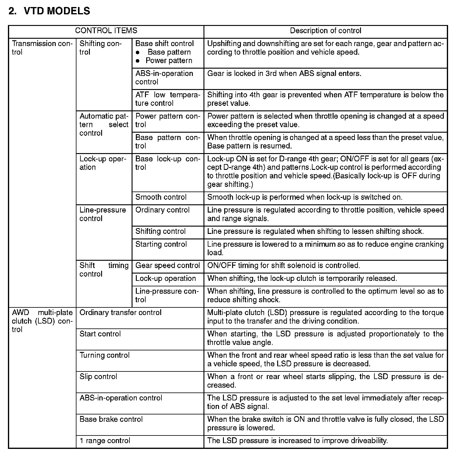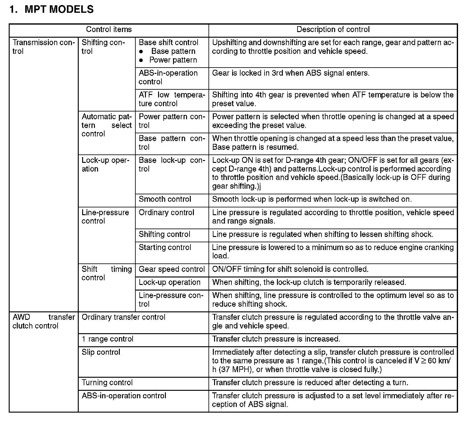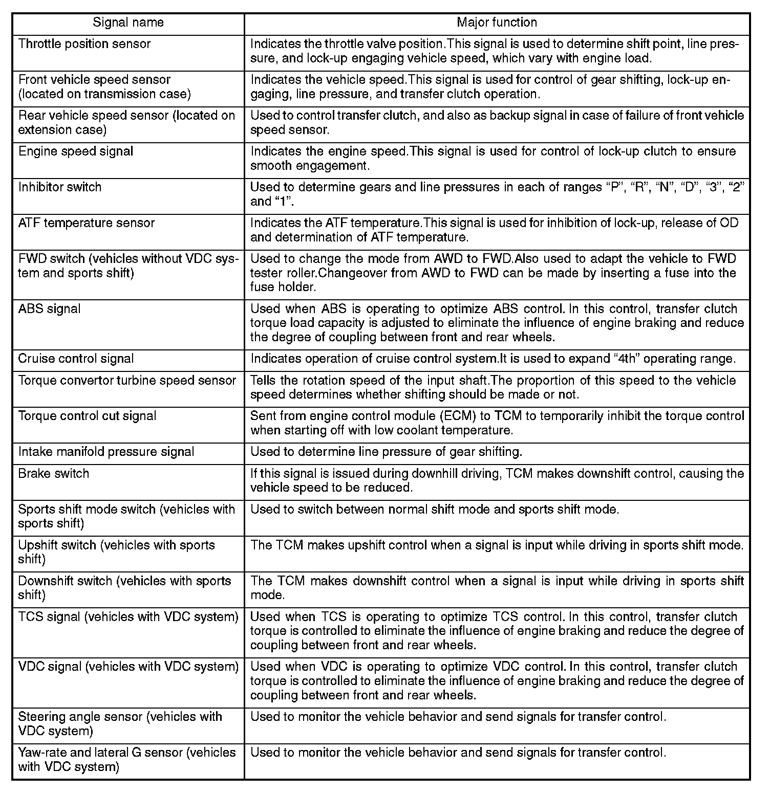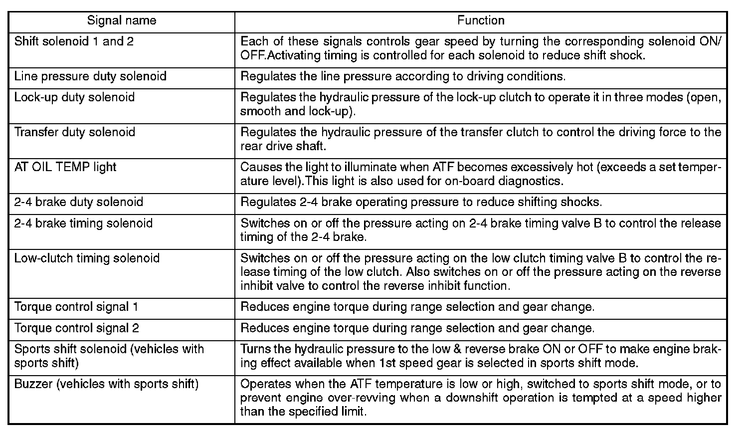 The electrohydraulic control system for the transmission and transfer consists of various sensors and switches, a transmission control module (TCM) and the hydraulic controlling units including solenoid valves.The system controls the automatic transmission operation, including gear shifting, lock-up clutch operation, line pressure, automatic shift pattern selection ("Base" and "Power"), and gear-shift timing.It also controls the operation of the transfer clutch.The TCM determines vehicle operating conditions from various input signals and controls a total of eight solenoids (shift solenoids 1 and 2, low clutch timing solenoid, 2-4 brake timing solenoid, line pressure duty solenoid, lock-up duty solenoid, transfer duty solenoid, and 2-4 brake duty solenoid) by sending appropriate signals to them.A sports shift solenoid is also equipped to make engine braking effect available when 1st speed gear is selected in sports shift mode.
