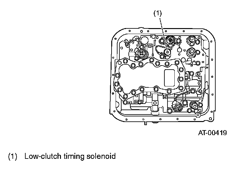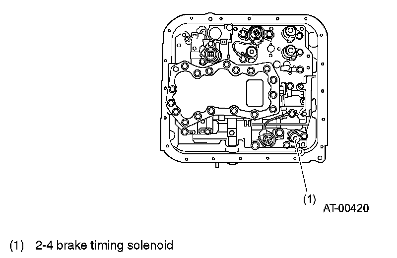 This solenoid is mounted on the transmission hydraulic control valve body.It is turned ON or OFF according to signals from the TCM.It then controls the 2-4 brake timing valve B to decrease the change gear shock.It then controls the low clutch timing valve B and reverse inhibitor valve.