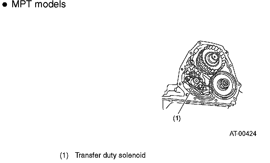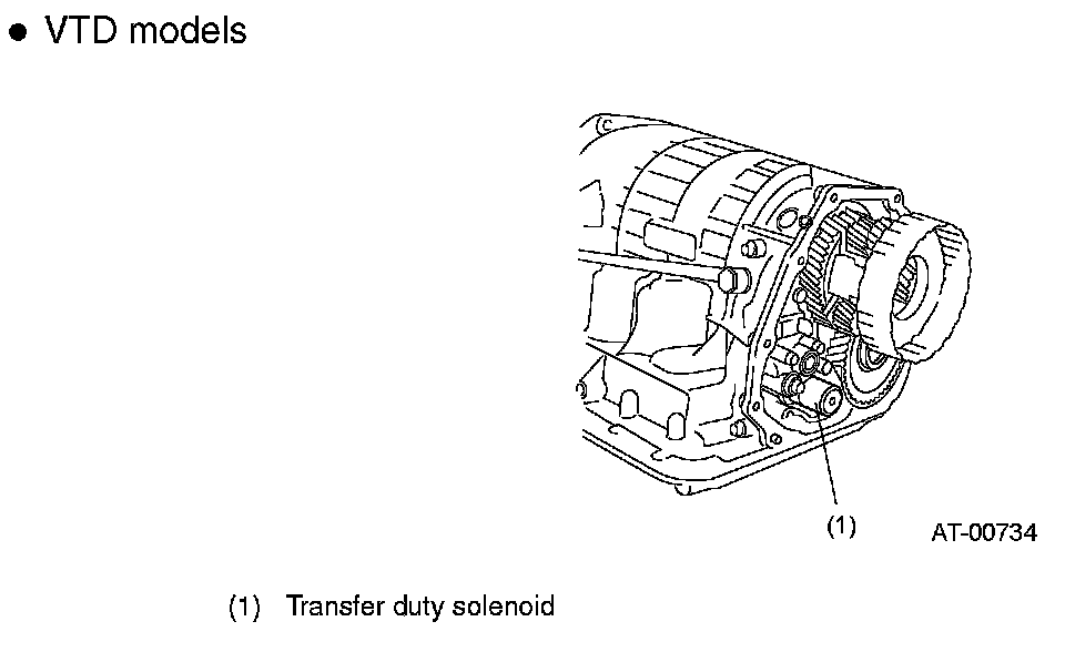 This solenoid is mounted on the transfer hydraulic pressure control unit on the rear end of transmission case. Its duty ratio is controlled by signals from the TCM. It then controls the transfer clutch/control valve to control the pressure applied to the transfer clutch.