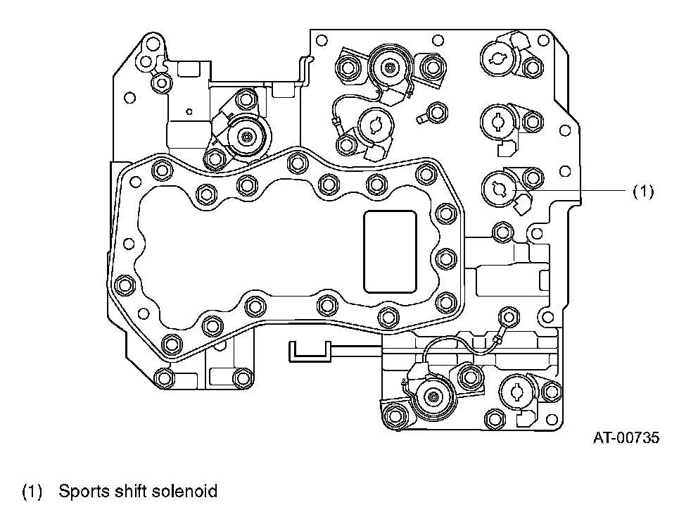 This solenoid is mounted on the transfer hydraulic control valve body on the rear end of transmission case. It is turned ON or OFF according to signals from the TCM. Thus the sports shift control valve is controlled when 1st speed gear is selected in sports shift mode.