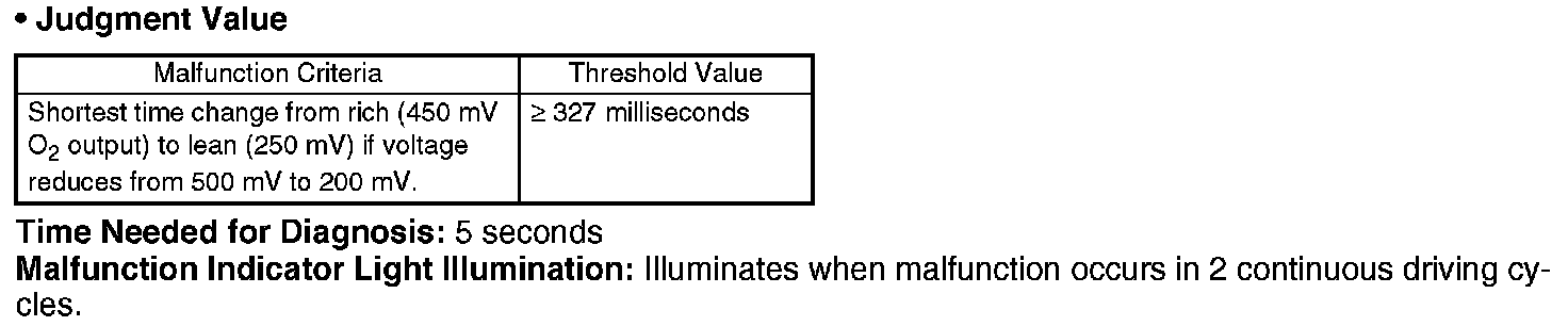 When the rear oxygen sensor output voltage changes from 0.5 V (rich) to 0.2 V (lean), calculate the Min. value of response time regarded as judgment value while the output varies from 0.45 V to 0.25 V.