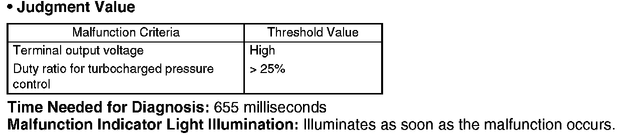 Detect the open or short circuit of wastegate control solenoid valve. Judge NG when the terminal output voltage remains Low or High during outputting the duty signal.