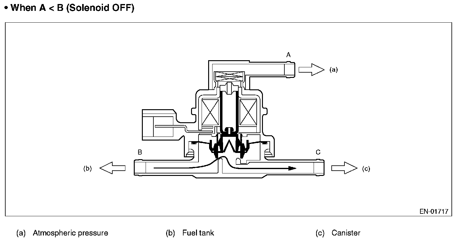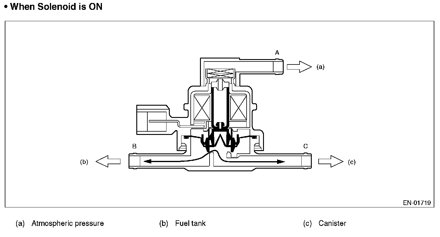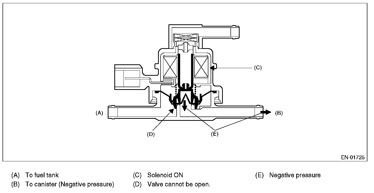 Normally, the solenoid is set to OFF. And the valve opens and closes mechanically in accordance with the pressure difference between tank and atmospheric air, or tank and canister.