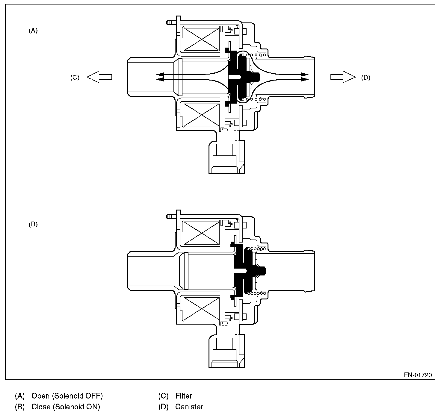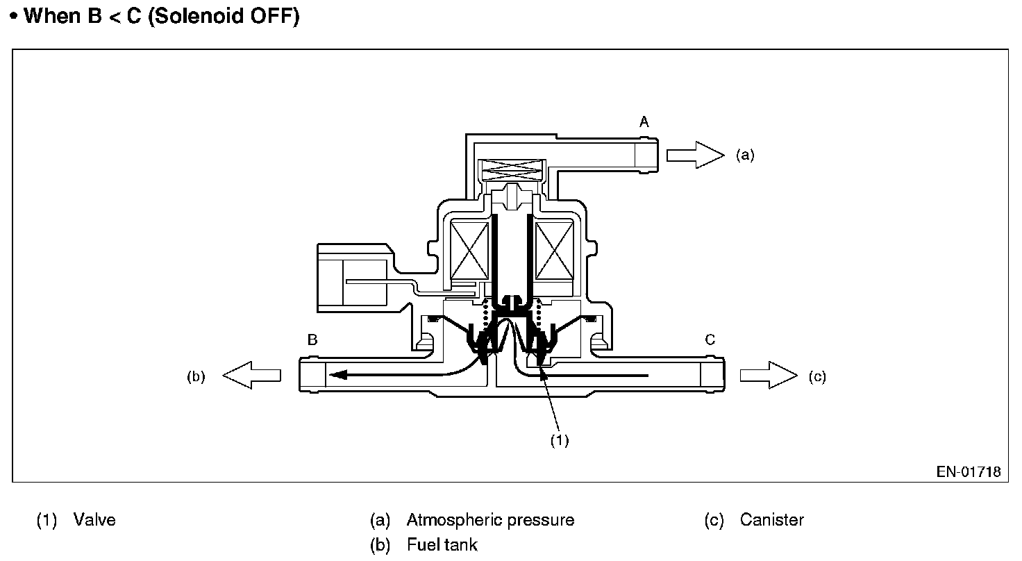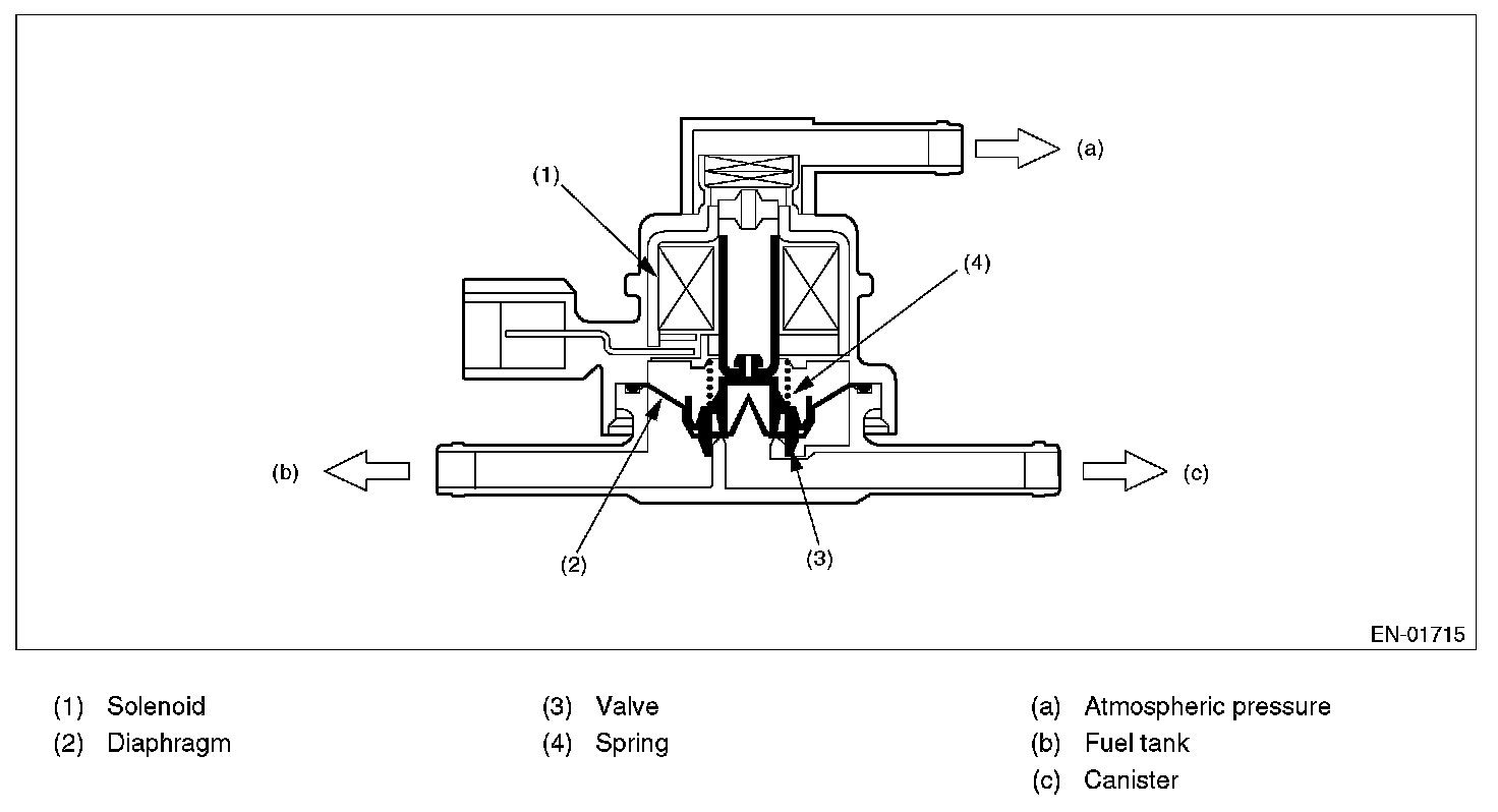 Normally, the solenoid is set to OFF. And the valve opens and closes mechanically in accordance with the pressure difference between tank and atmospheric air, or tank and canister.