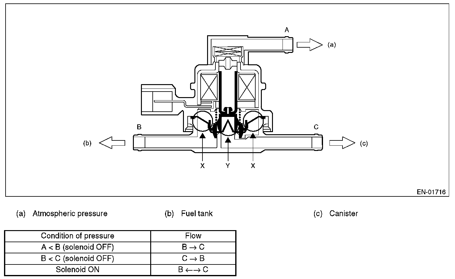 If the atmospheric air pressure port is A, tank pressure port is B, and canister pressure port is C, the air flows according to pressure difference from each port as shown in the table.