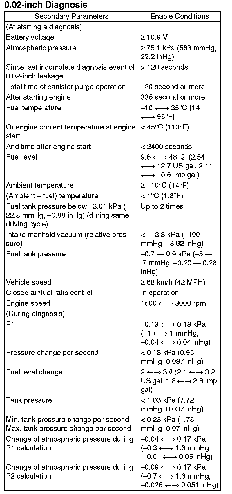 Approx. 0 -> -3.05 kPa (0 -> -22.9 mmHg, 0 -> -0.9 inHg) (0.02-in diagnosis)