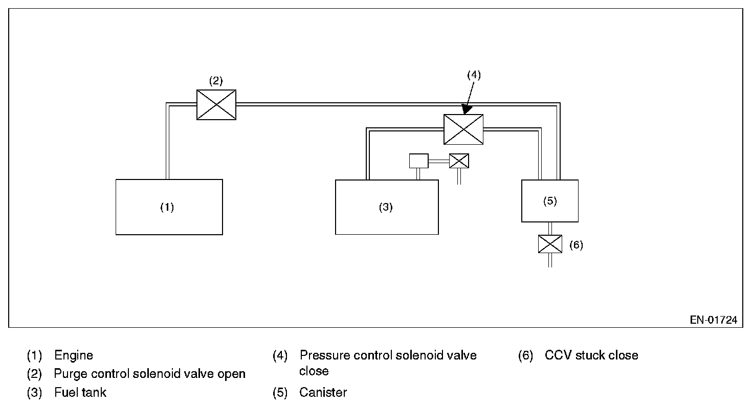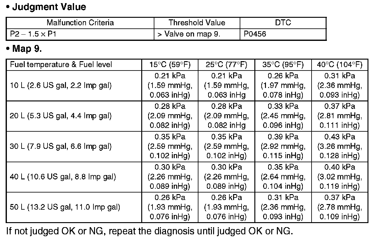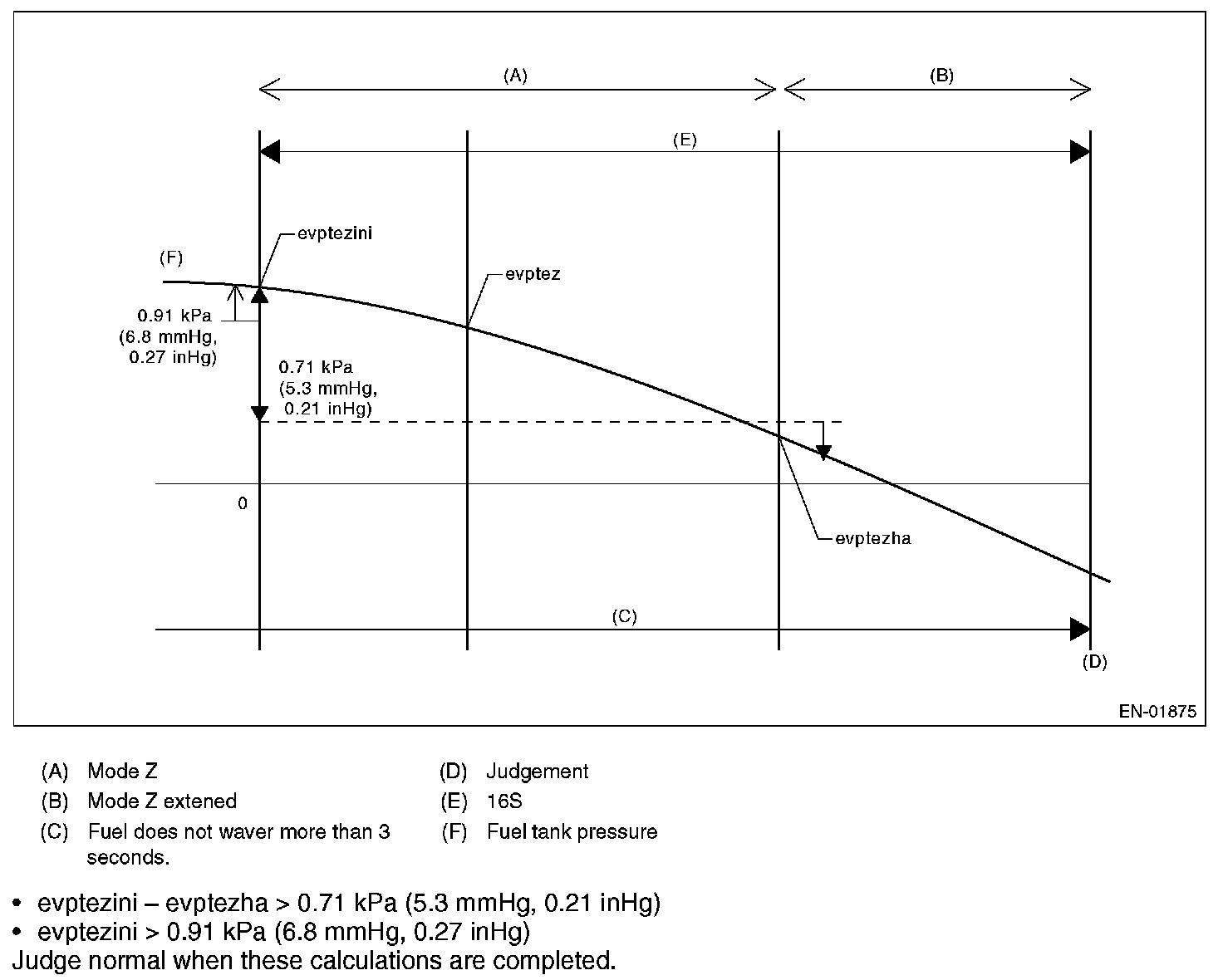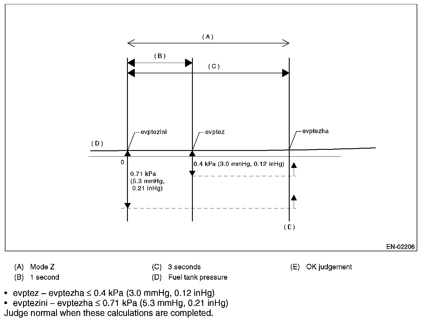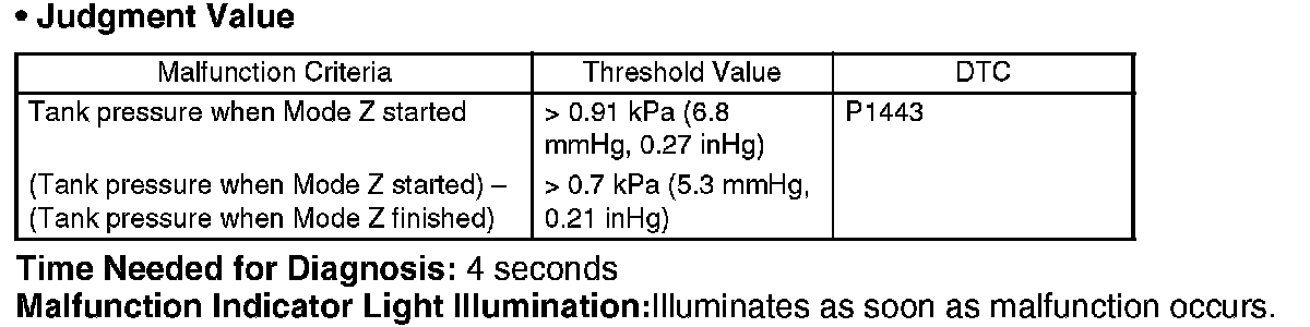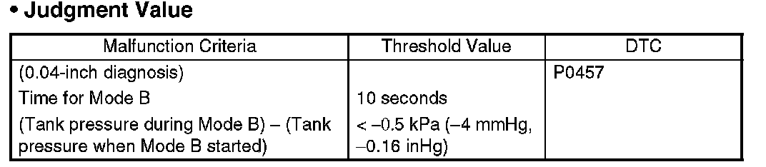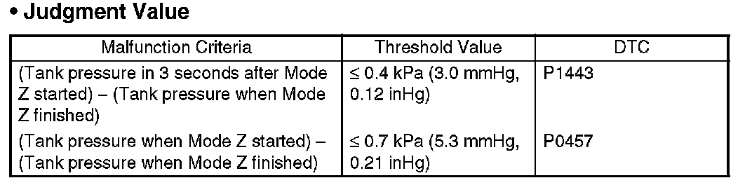 The tank pressure must become again as high as the atmospheric air pressure, after the evaporation diagnosis (normal judgment on Mode C or after Mode D). If the tank pressure does not become as high as the atmospheric air pressure, judge that CCV is blocked. Judge NG when the criteria are completed.