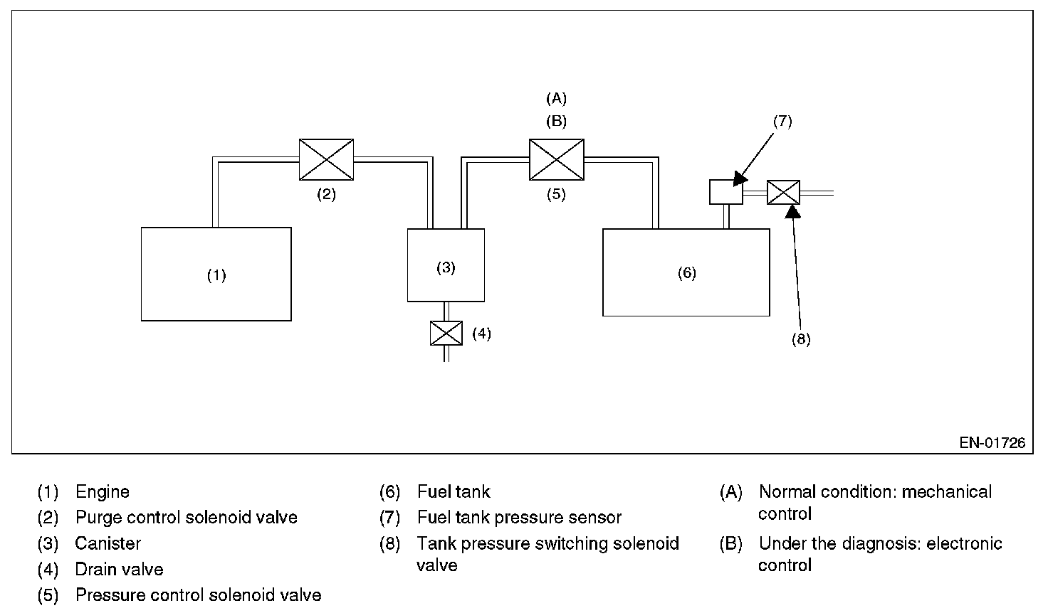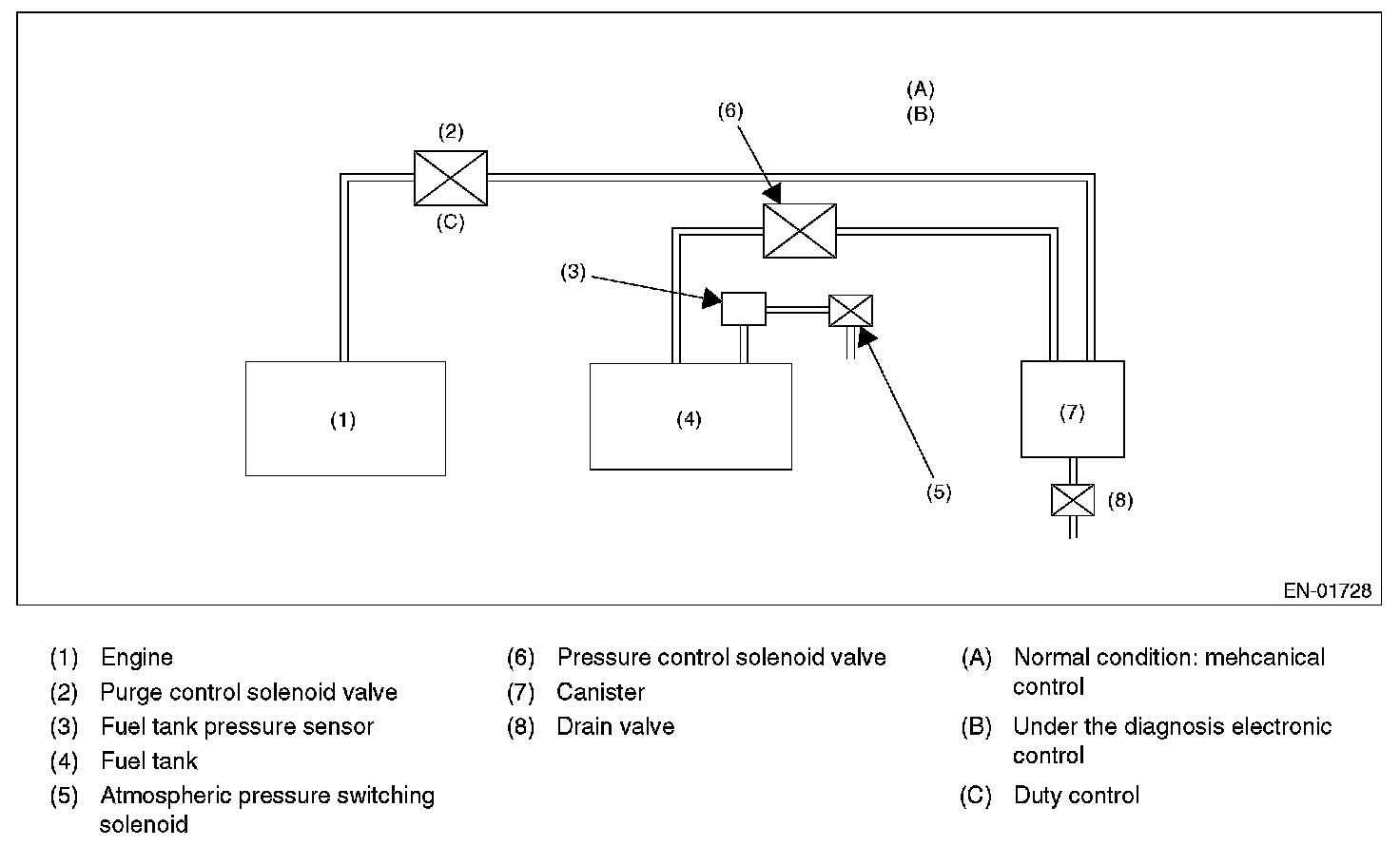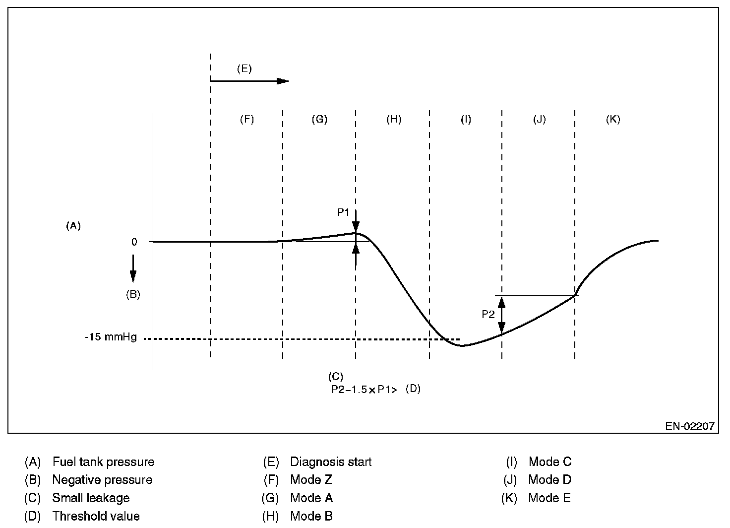 In this system diagnosis, checking for leakage and valve function is conducted by changing the fuel tank pressure, and monitoring the pressure change using the fuel tank pressure sensor. 0.04 inch diagnosis is performed in the order of mode Z, mode A, mode B, mode C, mode D and mode E, and 0.02 inch diagnosis is performed in the order of mode Y, mode A, mode B, mode C, mode D and mode E.