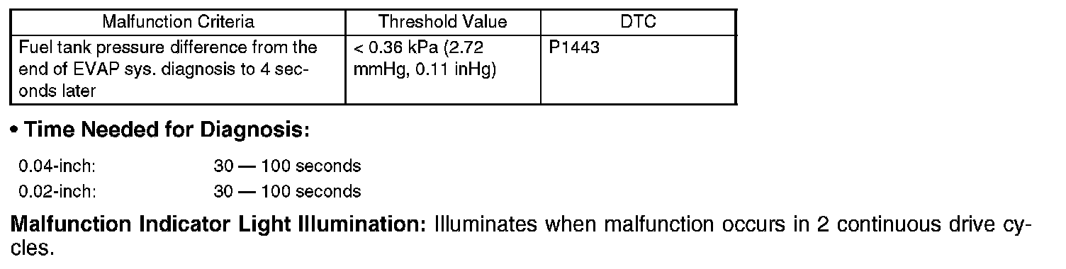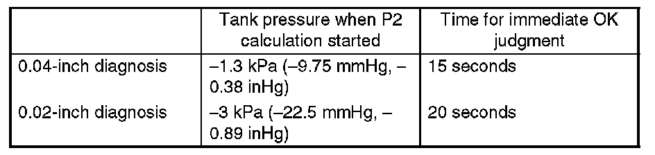 Finish the Evap. diagnosis when judging large leak (10 seconds) in 0.04-inch diagnosis. Cancel the diagnosis (10 to 20 seconds) in 0.02-inch diagnosis.