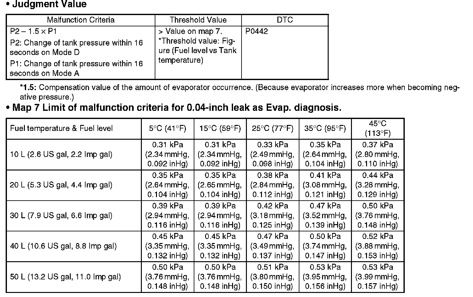 Approx. 0 -> -1.4 kPa (0 -> -10.5 mmHg, 0 -> -0.41 inHg) (0.04-in diagnosis)