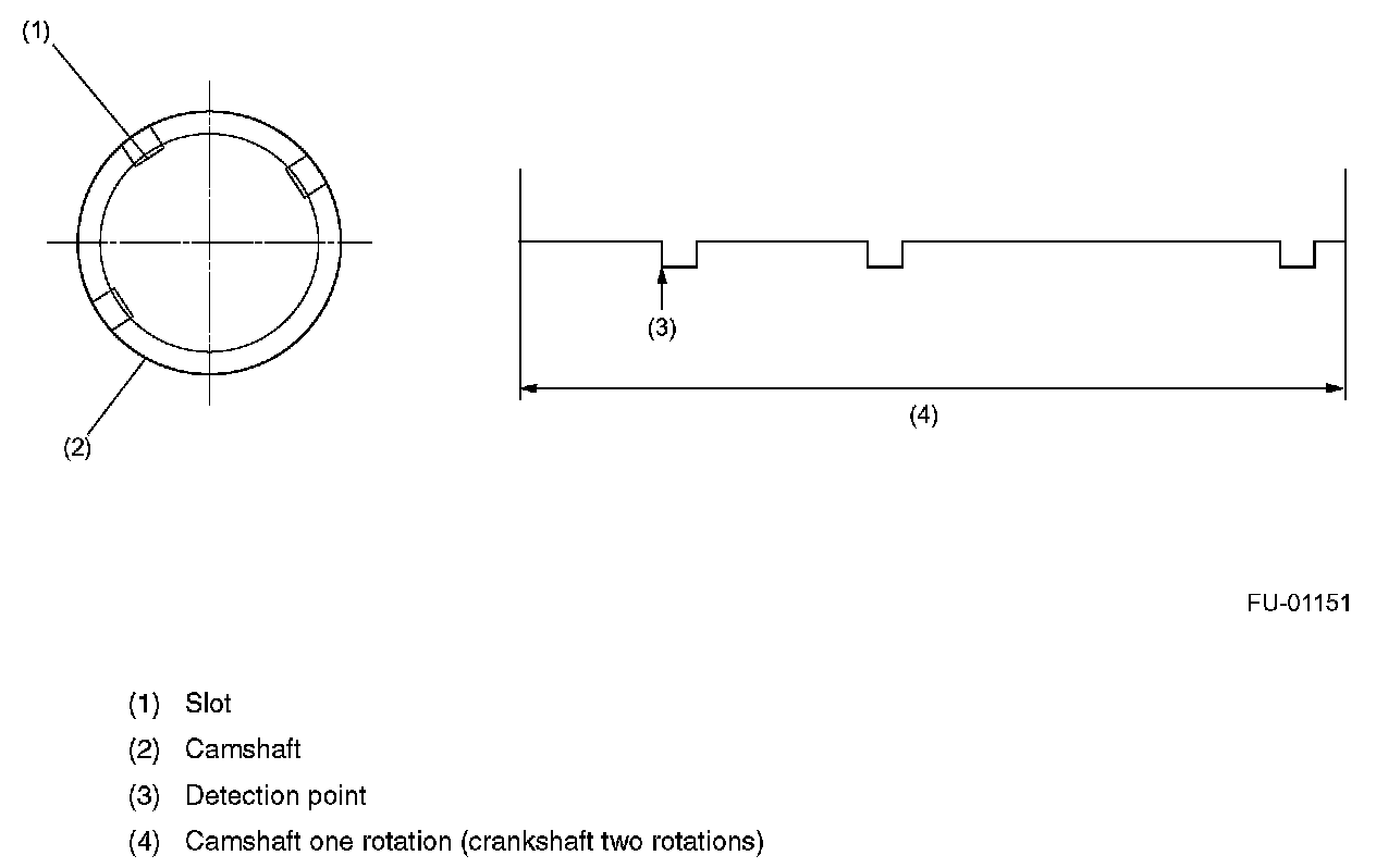 - The sensor generates a pulse when one of the slots in the camshaft passes in front of the sensor. The ECM detects the camshaft position by measuring the pulse. Three slots are provided on the camshaft as shown.