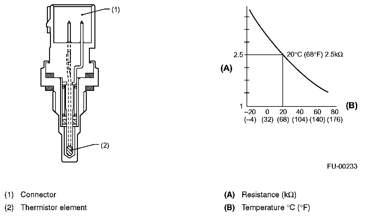 The engine coolant temperature sensor is located on the engine coolant pipe. The sensor uses a thermistor whose resistance changes inversely with temperature. Resistance signals as engine coolant temperature information are transmitted to the ECM to make fuel injection, ignition timing, purge control solenoid valve and other controls.