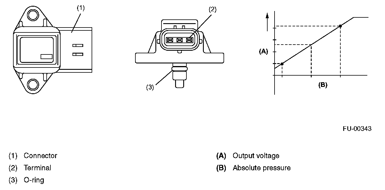 MANIFOLD ABSOLUTE PRESSURE SENSORThe manifold absolute pressure sensor is attached to the top of the throttle body, and continuously sends to the engine control module (ECM) voltage signals that are proportional to intake manifold absolute pressures. The ECM controls the fuel injection and ignition timing based on the intake manifold absolute pressure signals in addition to other signals from many sensors and other control modules.