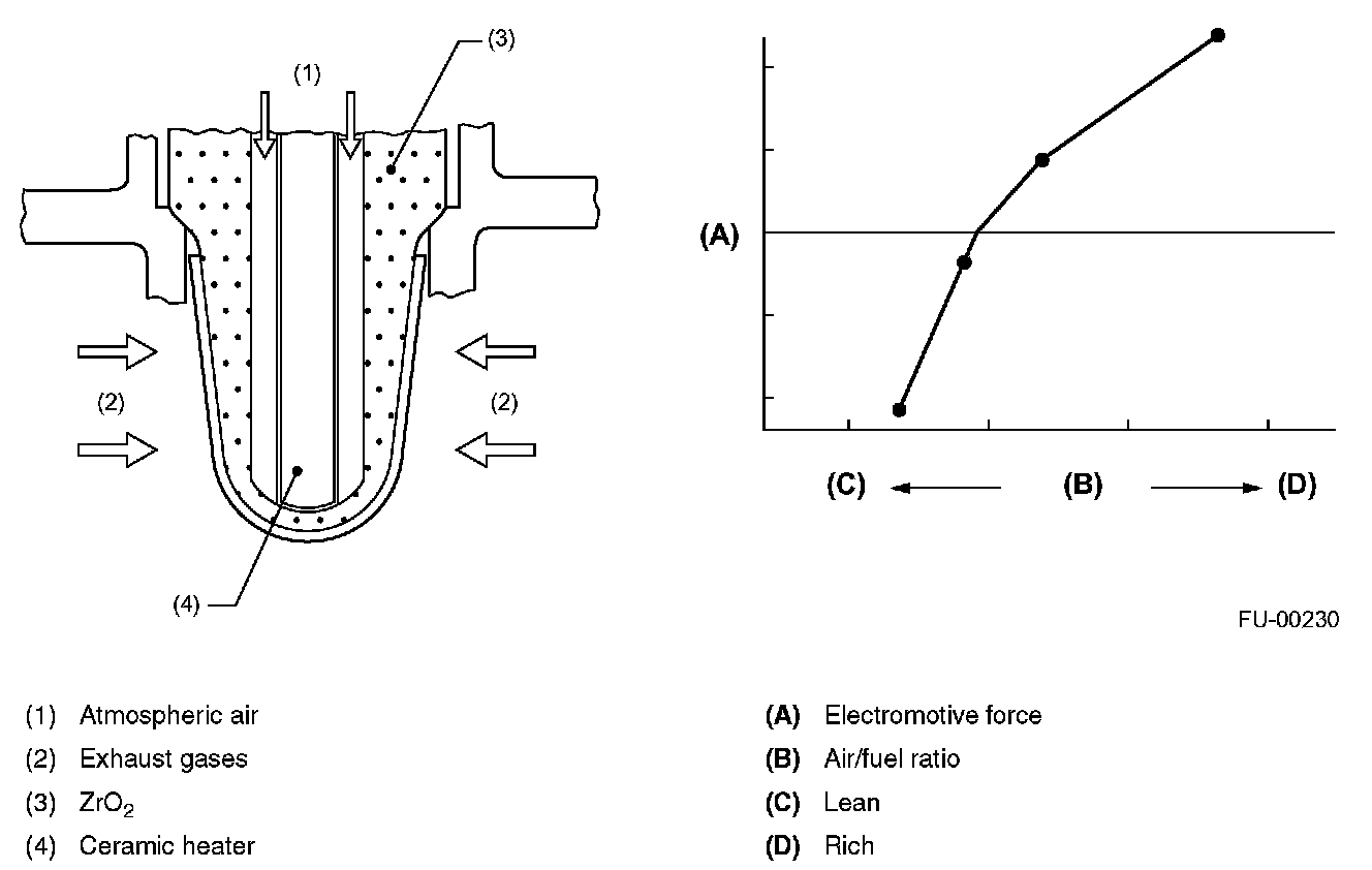 - When a lean air-fuel mixture is burnt in the cylinder, relatively large amount of oxygen remains in the exhaust gases even after the catalytic action, and this results in a small difference in the oxygen ion concentration between the tube's internal and external surfaces. The electromotive force in this case is very small.
