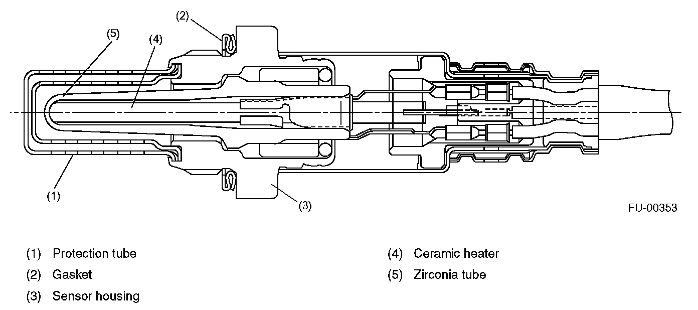 - The rear oxygen sensor has a zirconia tube (ceramic) which generates voltage if there is a difference in oxygen ion concentration between the inside and outside of the tube. Platinum is coated on the inside and outside of the zirconia tube as a catalysis and electrode material. The sensor housing is grounded to the exhaust pipe and the inside is connected to the ECM through the harness.