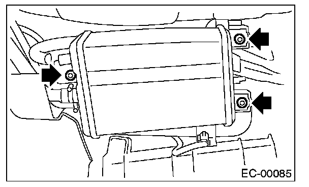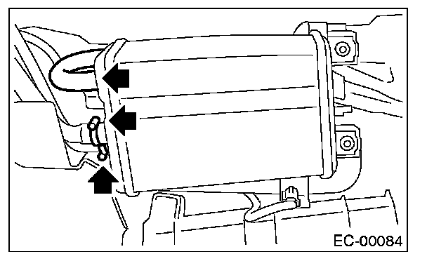 2. Loosen two clamps which hold two canister hoses, and disconnect evaporation three hoses from canister.