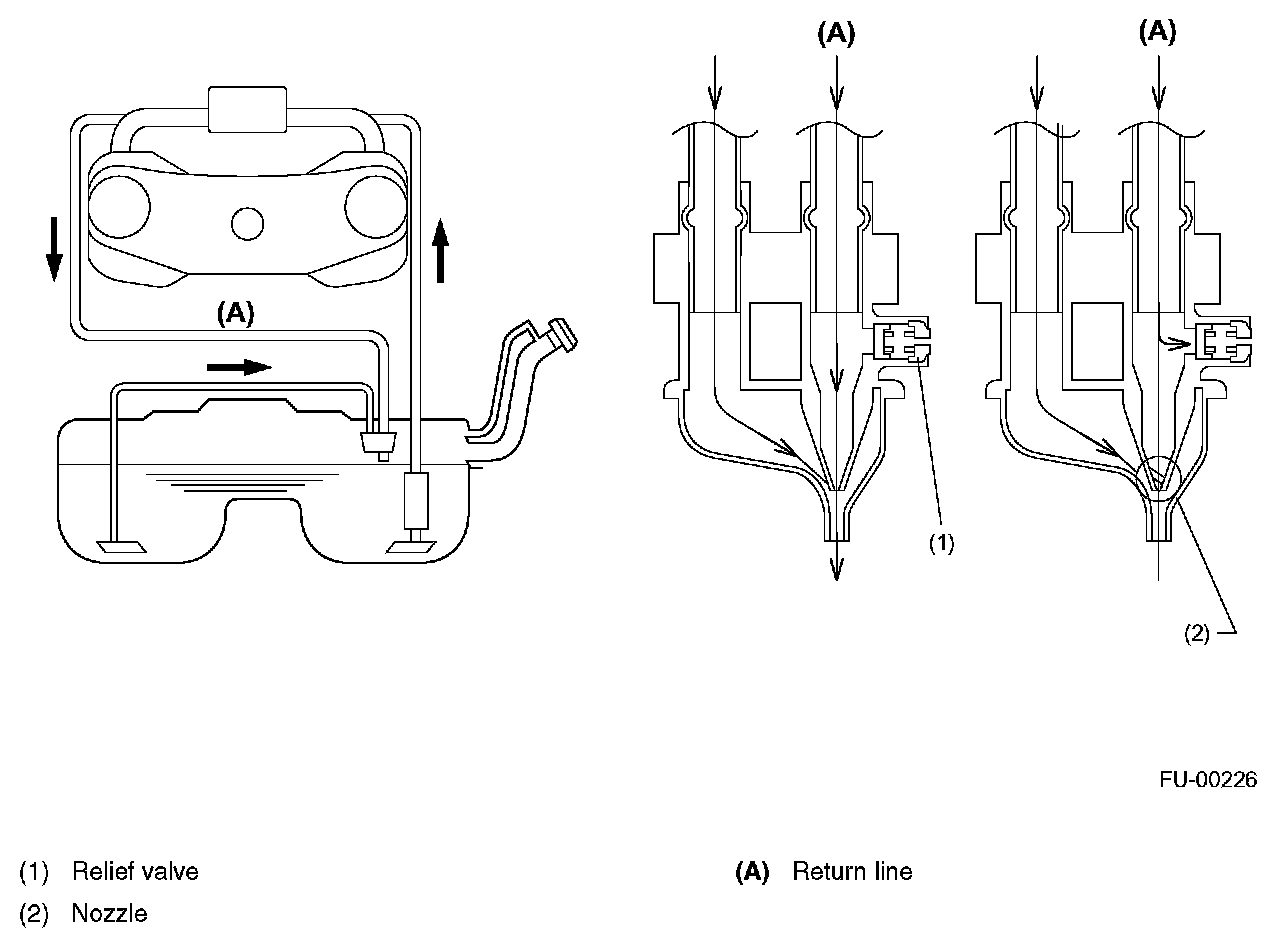 - When the return line nozzle is clogged, the fuel sent back through the return line flows back into the fuel tank via the relief valve.