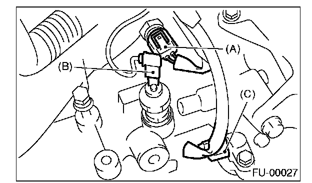 3. Connect the connector to the oil pressure switch (B), crankshaft position sensor (C) and engine coolant temperature sensor (A).