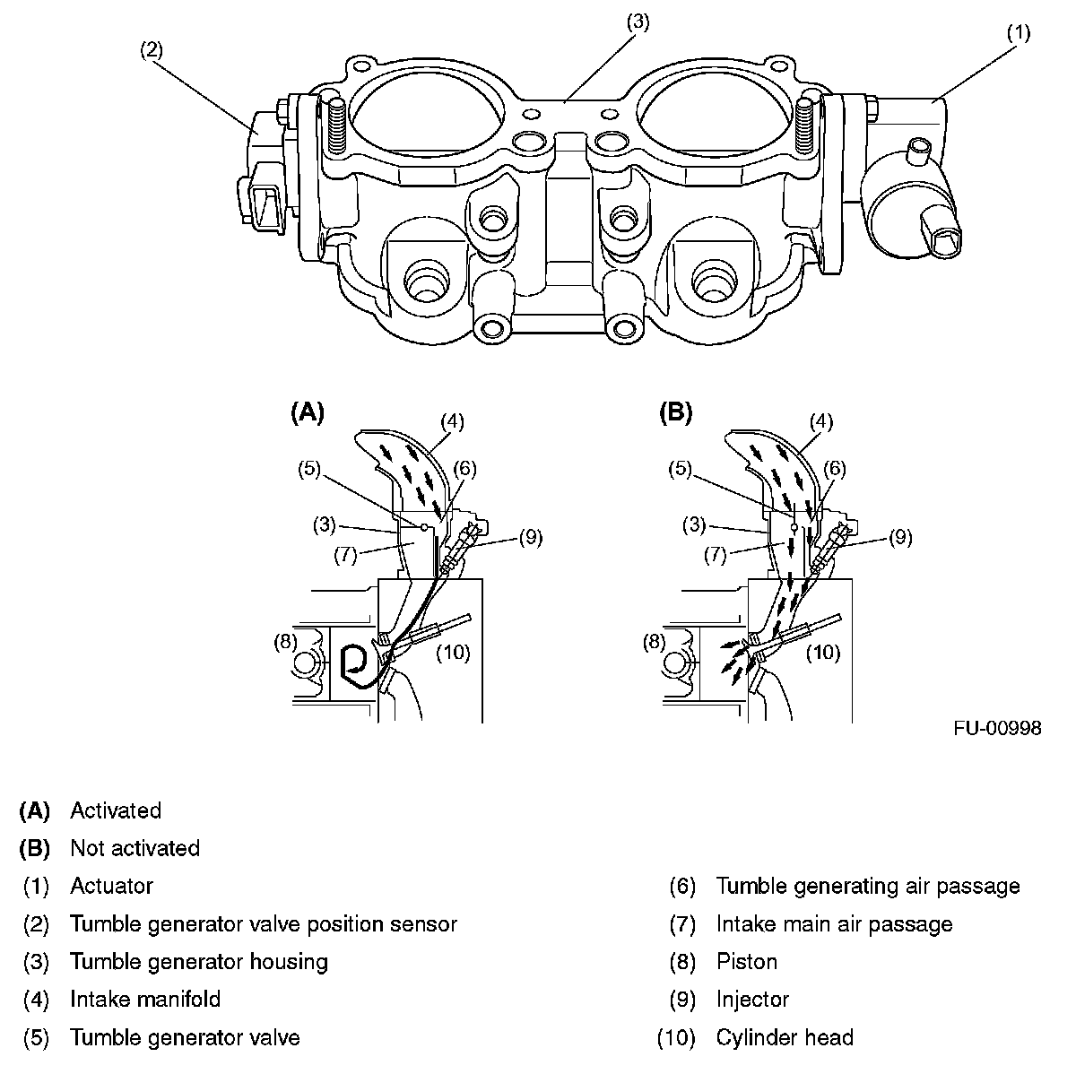 TUMBLE GENERATOR VALVE- A tumble generator valve is provided on each engine bank, between the intake manifold and intake air ports. The right bank tumble generator valve has butterfly valves for the #1 and #3 cylinders and the left bank tumble generator valve has those for the #2 and #4 cylinders. The two butterfly valves in each tumble generator valve are fitted on a single shaft that is driven by an actuator.