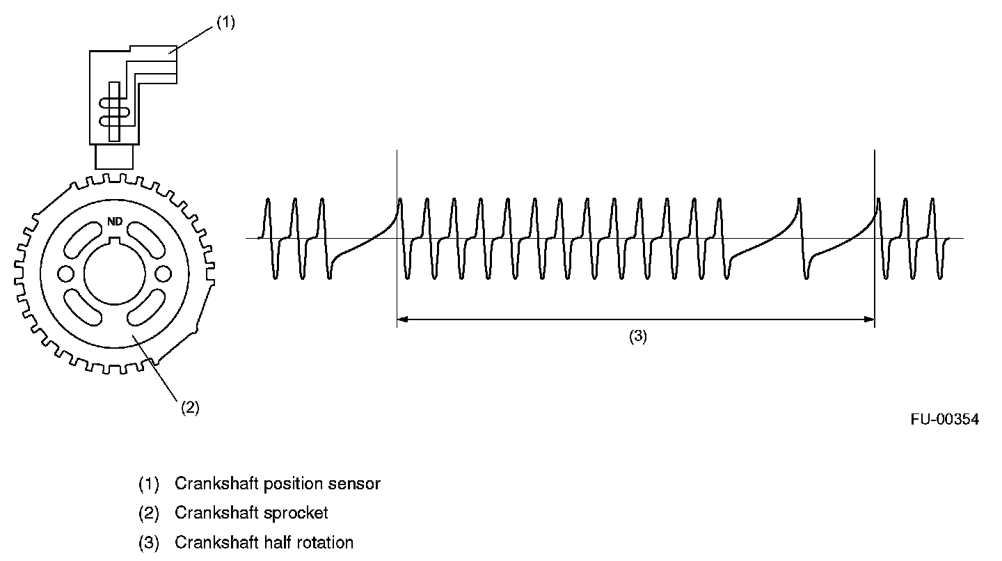 CRANKSHAFT POSITION SENSOR- The crankshaft position sensor is installed on the oil pump which is located in the front center portion of the cylinder block. The sensor generates a pulse when one of the teeth on the perimeter of the crankshaft sprocket (rotating together with the crankshaft) passes in front of it. The ECM determines the crankshaft angular position by counting the number of pulses.