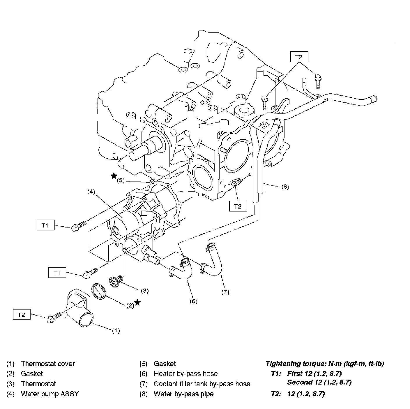 ^ When installing the water pump, tighten the bolts in two stages in alphabetical sequence as shown in the figure