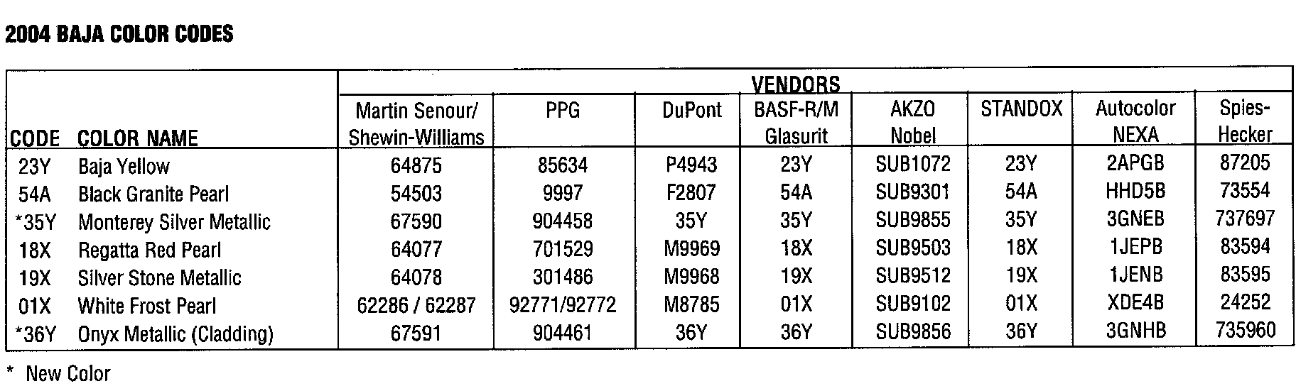 codes are found on the VIN plate located on the Left Strut Tower. The color code is depicted by a solid color or by a combined upper and lower color code.