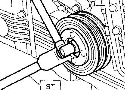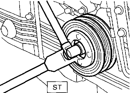 2. Remove crankshaft pulley bolt. To lock crankshaft, use ST.
