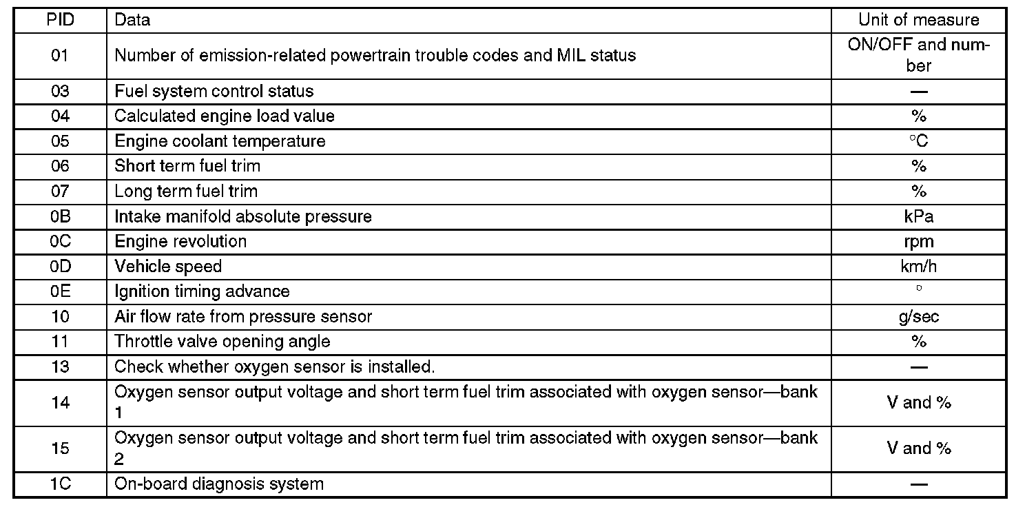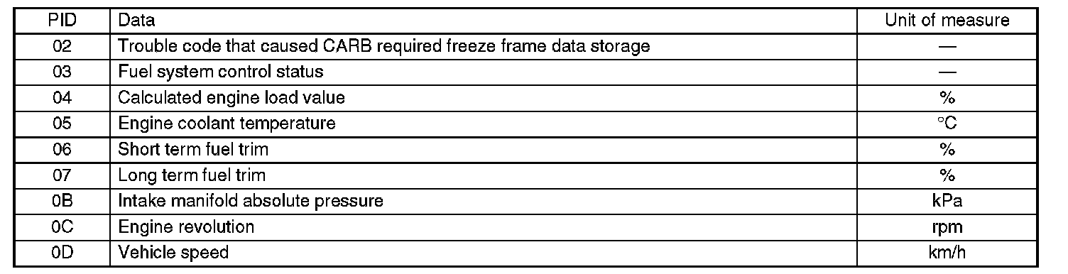 Refers to data denoting the operating condition when trouble is sensed by the on-board diagnosis system. A list of the support data and PID (Parameter Identification) codes are shown in the table.