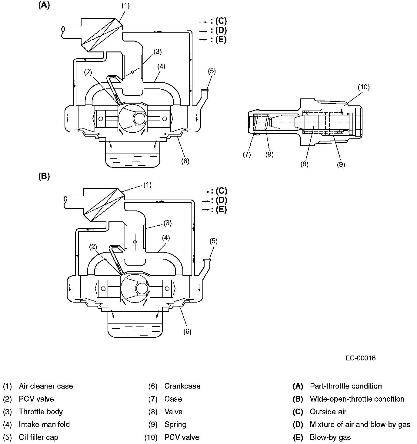 - In a part-throttle condition, the blow-by gas in the crankcase flows into the intake manifold through the connecting hose of crankcase and PCV valve by the strong vacuum created in the intake manifold. Under this condition, fresh air is introduced into the crankcase through the connecting hose of the rocker cover.