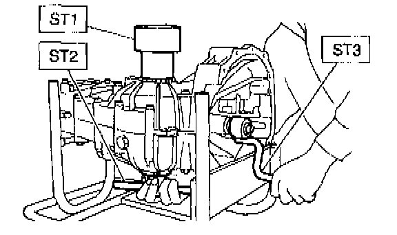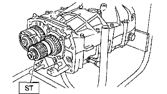 10. Screw retainer assembly into left case from the bottom with ST2. Fit ST3 on the transmission main shaft. Shift gear into 4th or 5th and turn the shaft several times. Screw in the retainer while turning ST3 until a slight resistance is felt on ST2. This is the contact point of hypoid gear and drive pinion shaft. Repeat the above sequence several times to ensure the contact point.