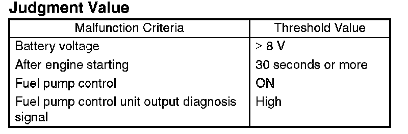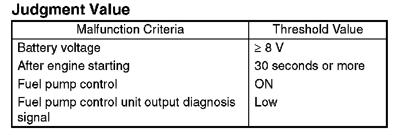 Judge NG when the NG signal is sent through a diagnostic line coming from the fuel pump control unit. Fuel pump control unit detects the open or short circuit malfunction for each line, and then sends NG signals if one of them is found NG.