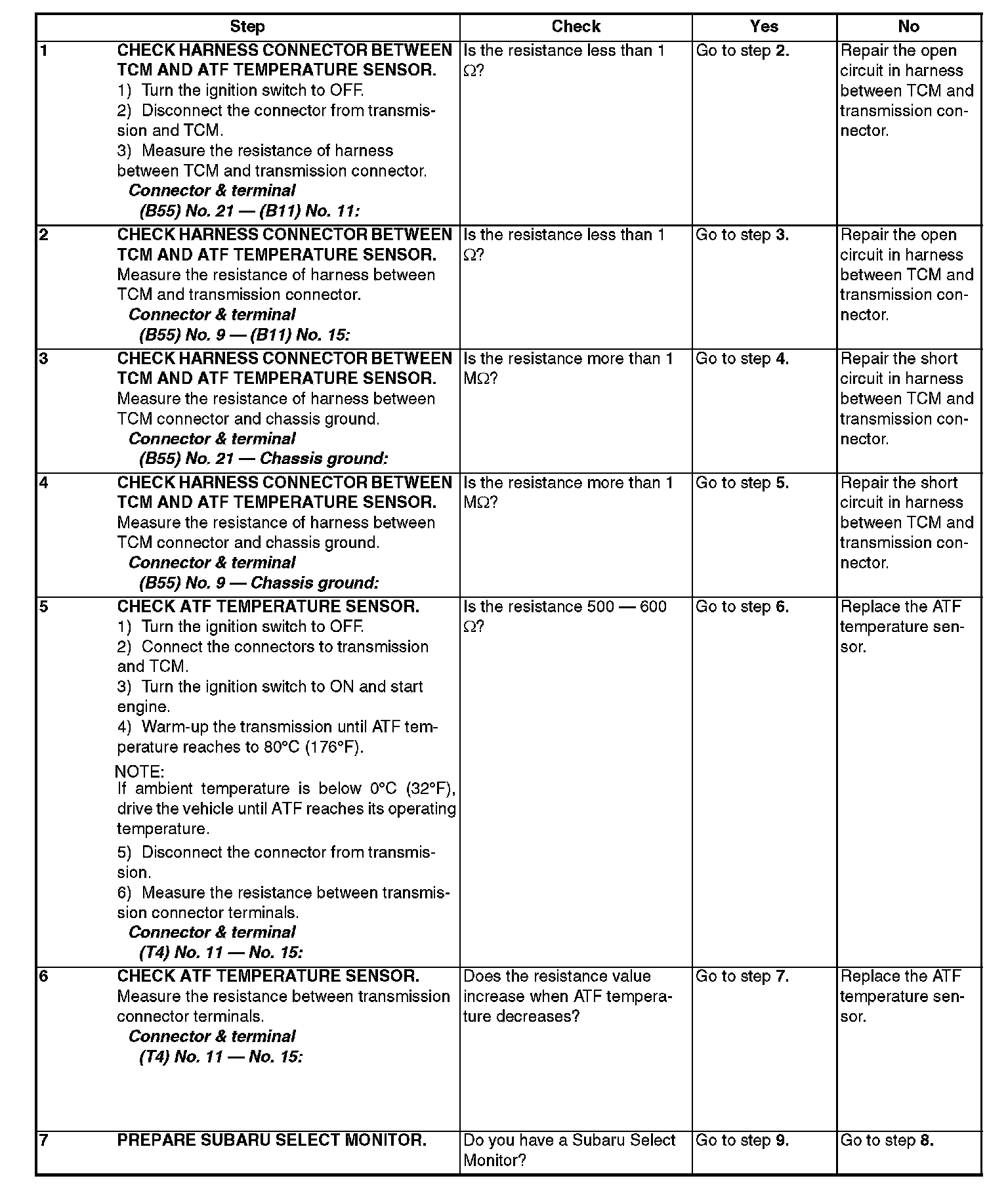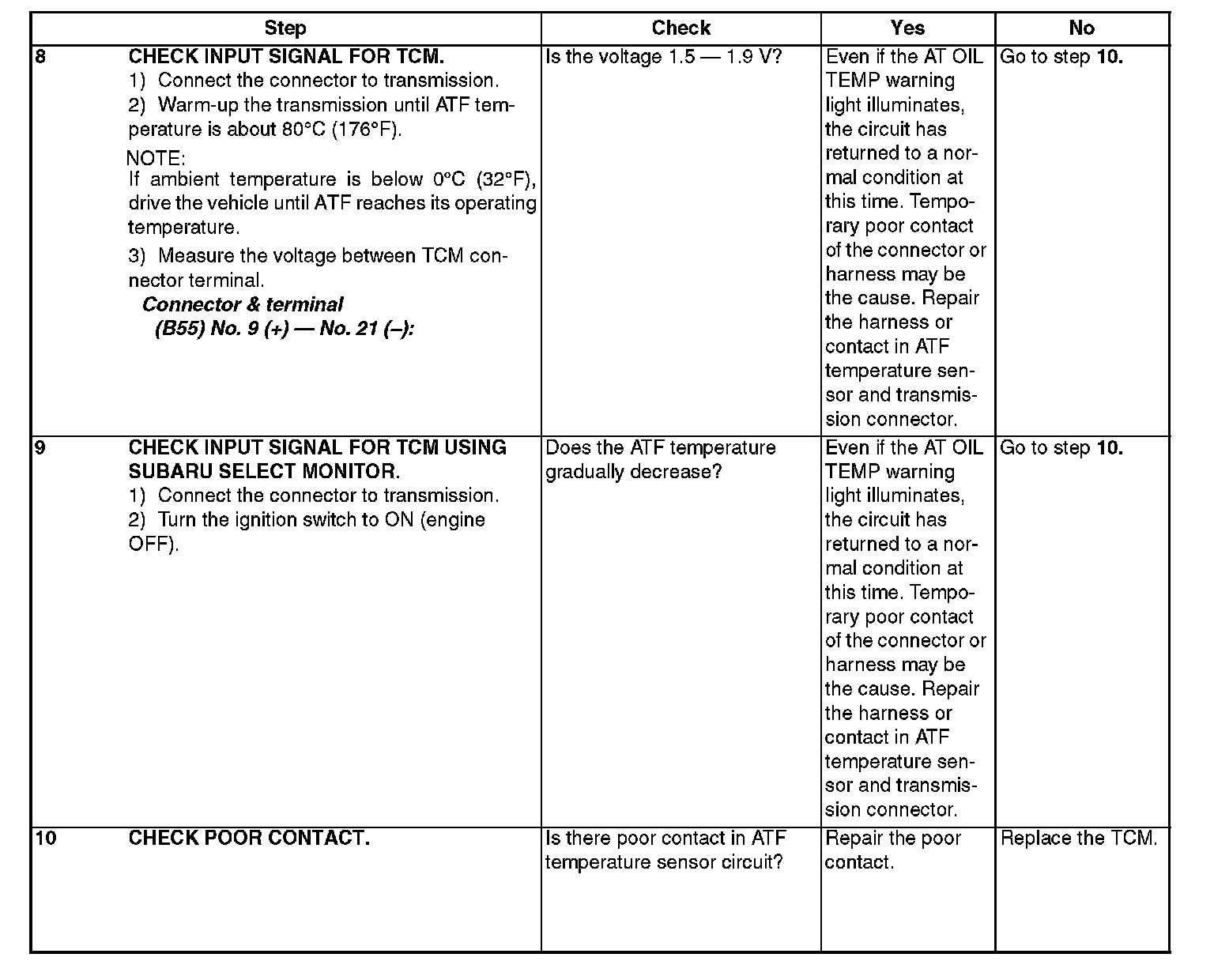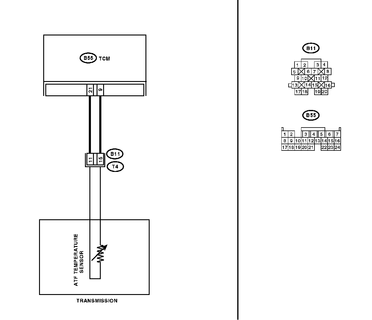 The input signal circuit of TCM to ATF temperature sensor is open or shorted.